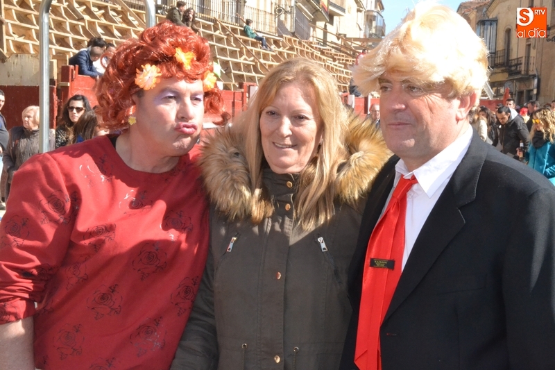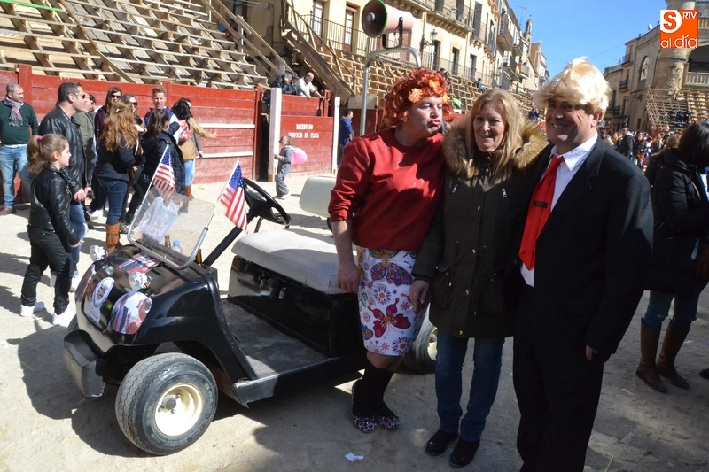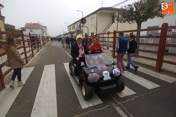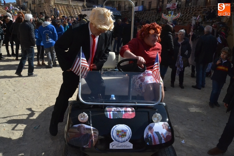 En la mañana del Domingo de Carnaval también destacó la vestimenta del concejal del Ayuntamiento Joaquín Pellicer, ataviado como Donald Trump, que junto a su inseparable Chuchi Cubas un año más sacaron su carrito a recorrer las calles, llegando también hasta la Plaza Mayor a última hora de la mañana. En ese momento se concentraban allí numerosos grupos, pidiéndole alguno de ellos incluso fotos a 'Donald Trump'.