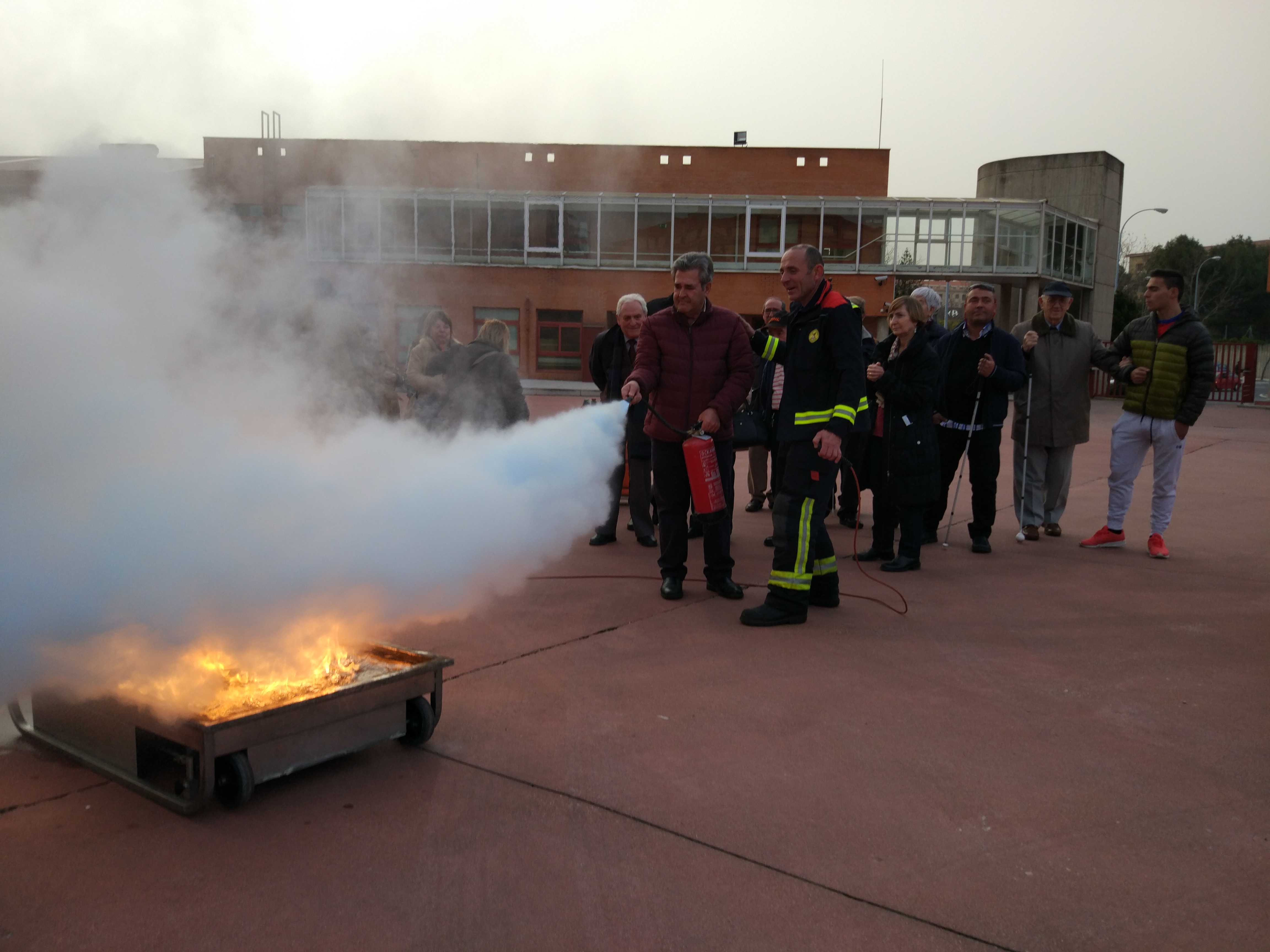 Las charlas se complementaron con una parte de formación práctica, en la que trabajaron con fuego real y extintores ayudados y protegidos por los Bomberos del Ayuntamiento. Los participantes también aprendieron a distinguir el sonido de las sirenas de los bomberos y descubrieron el equipamiento de los vehículos de bomberos y para qué se utiliza.
