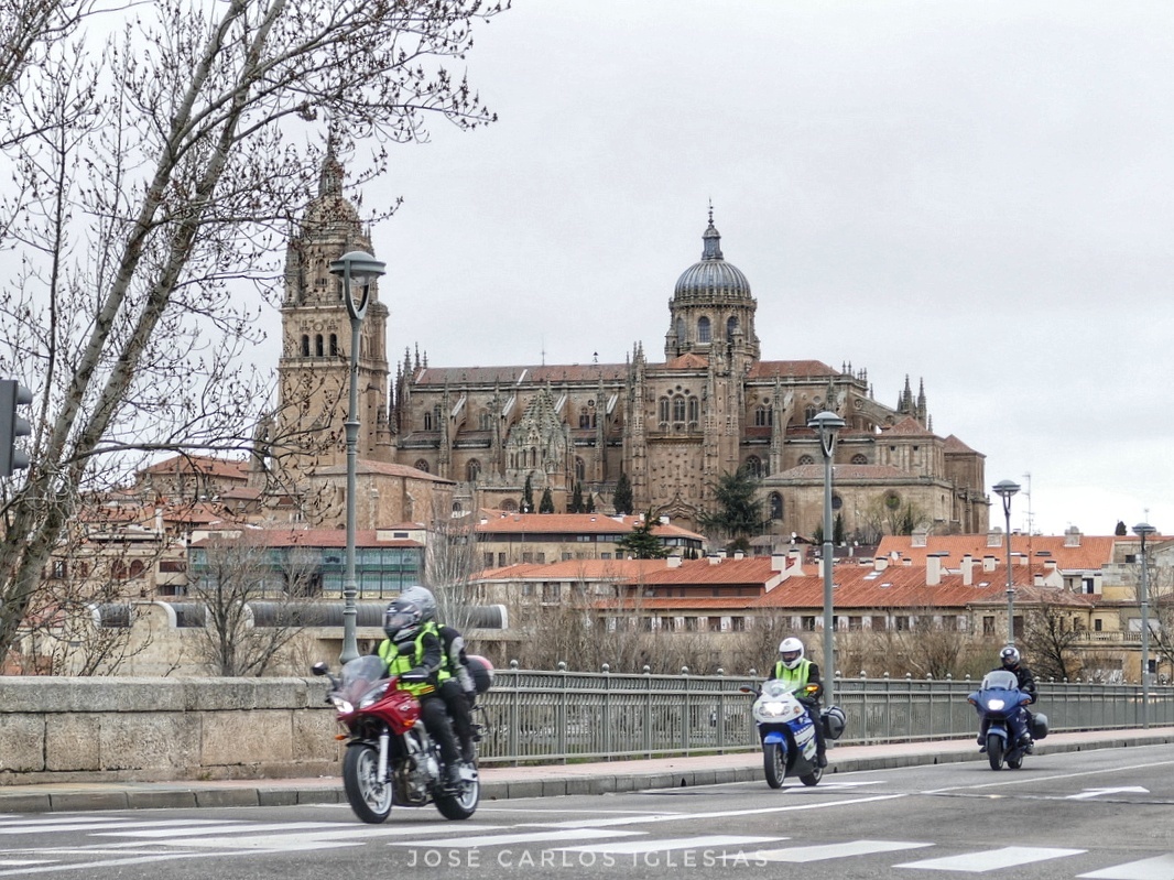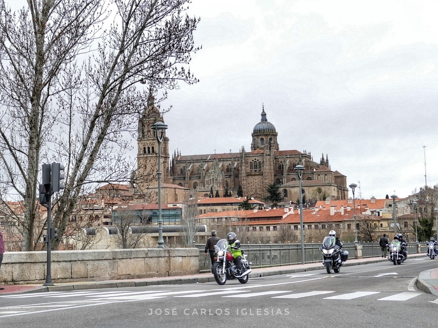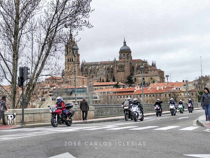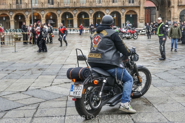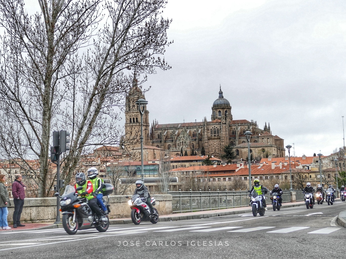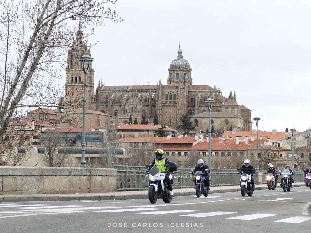 El inconfundible rugir de las dos ruedas por las calles de Salamanca, y al volante de las motos que han despertado la curiosidad de los viandantes, los moteros del Motoclub de La Virgen del Camino, llegados de diferentes provincias de Castilla y León. Con parada ineludible en la Plaza Mayor, han proseguido su ruta por la calle San Pablo en dirección al puente de hierro en este primer domingo de marzo que ha amanecido con el cielo encapotado. La iniciativa ha estado organizada por el Club Ruedas Charras.