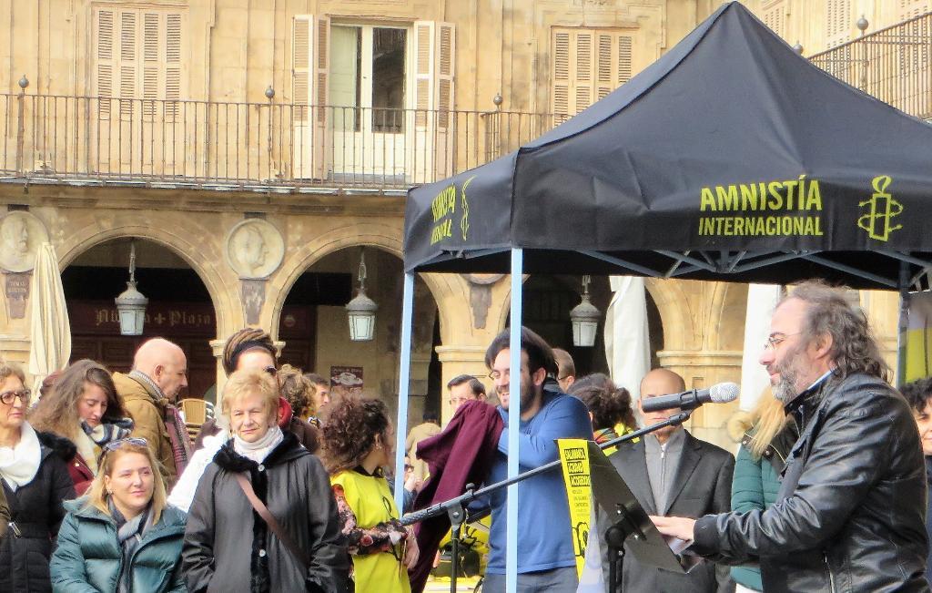 Desde Amnistía se invitó a personas destacadas en la vida académica, científica, cultural, artística o social salamantina, para que leyeran artículos de textos legales alusivos provenientes de la ONU, la Unión Europea, así como de España. Entre estos, cito al Decano de la Facultad de Derecho de la Usal, Ricardo Rivero Ortega, y el profesor de la Facultad de Ciencias Sociales, Alfredo Pérez Alencart. También asistieron representantes de otras fuerzas políticas. En el acto también participó el Grupo musical 'Blocco charro'.
