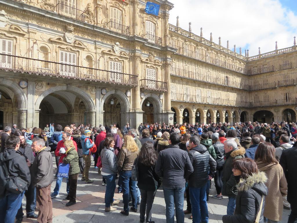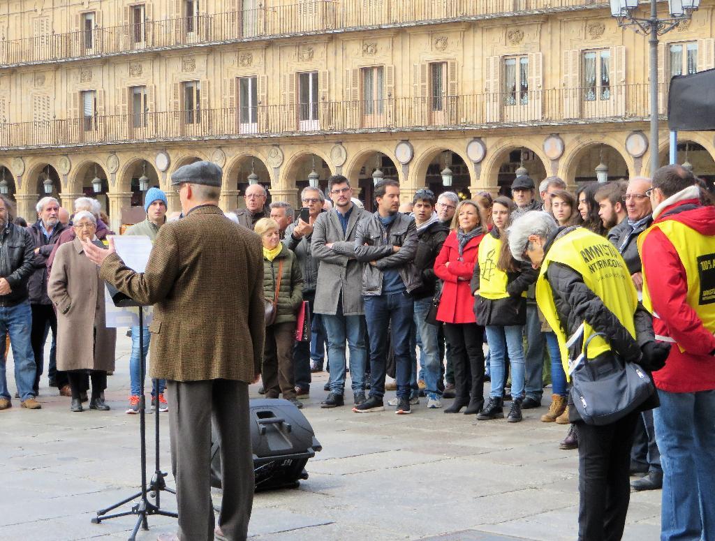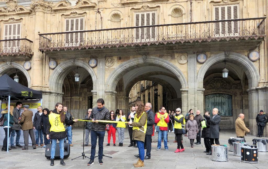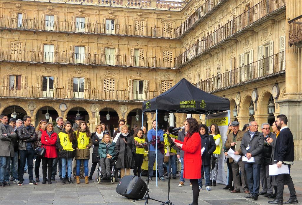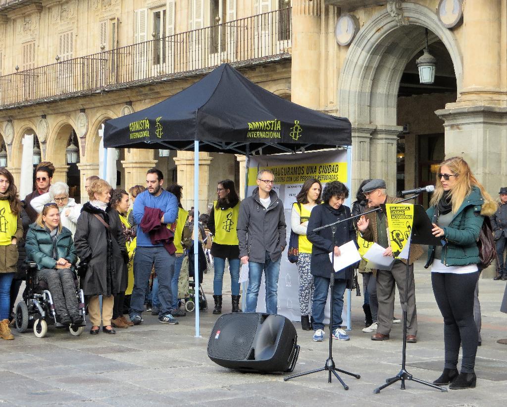 En estos días de invierno, en que por momentos se nos quieren congelar hasta los sentimientos y el pensamiento solidario, el impacto de un acto en la plaza Mayor, organizado por Amnistía Internacional Salamanca, trajo a la actualidad la dramática situación de los refugiados. El acto, que también a la misma hora se realizaba en muchas ciudades españolas, tuvo como objetivo, según fuentes de esta organización, solidarizarse con las personas que buscan refugio en Europa, con la intención de animar a los representantes locales a ofrecer plazas de asentamiento, de modo que el gobierno de la nación pueda cumplir el compromiso de recibir a las diecisiete mil personas a que se ha comprometido ante la UE.