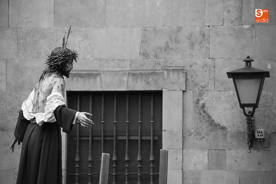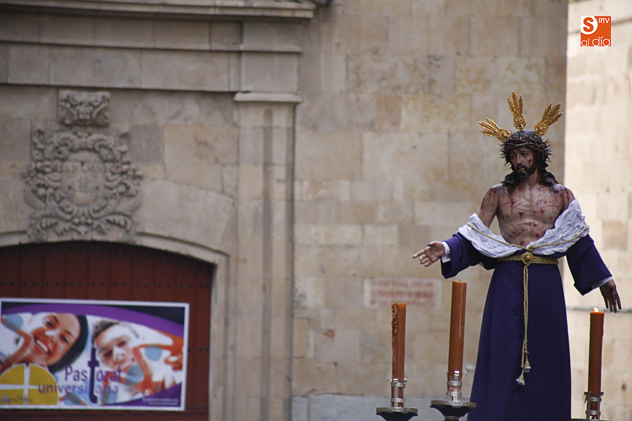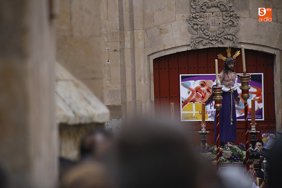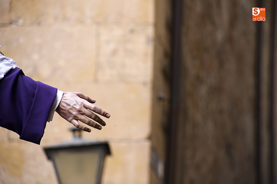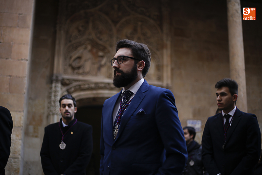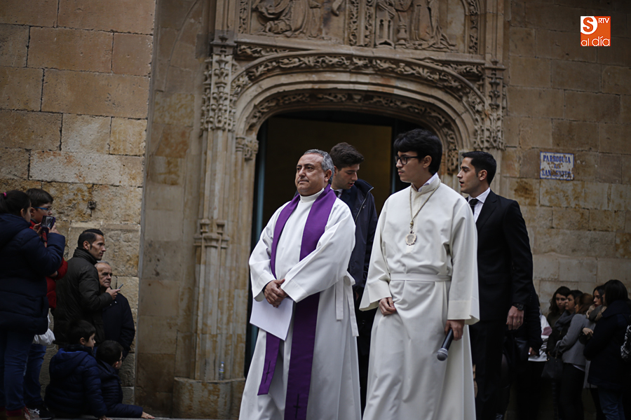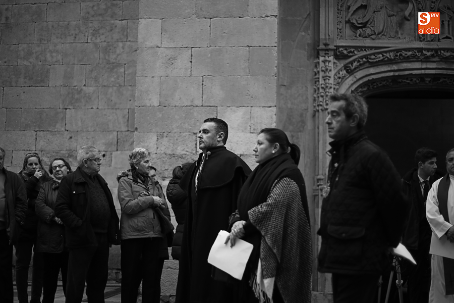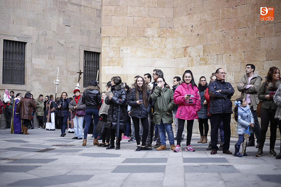 Amenazaba lluvia, pero, una vez más, la ilusión de lo que está por venir fue más fuerte. Se abrieron las puertas de la iglesia de San Benito y, tras el paso de velas, fieles y hermanos, una túnica morada se adivinaba entre el incienso. Comenzaron a caer unas tímidas gotas, pero, cuando el hombre de las vestiduras rasgadas besaba la piedra salmantina, el sol ganó el pulso. Y salieron a dar su primer paseo de Cuaresma el Despojado y su mirada, una mirada que empieza a fijarse en los cada vez más próximos días de Pasión.