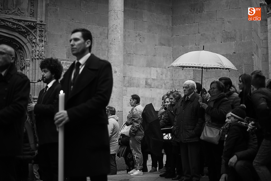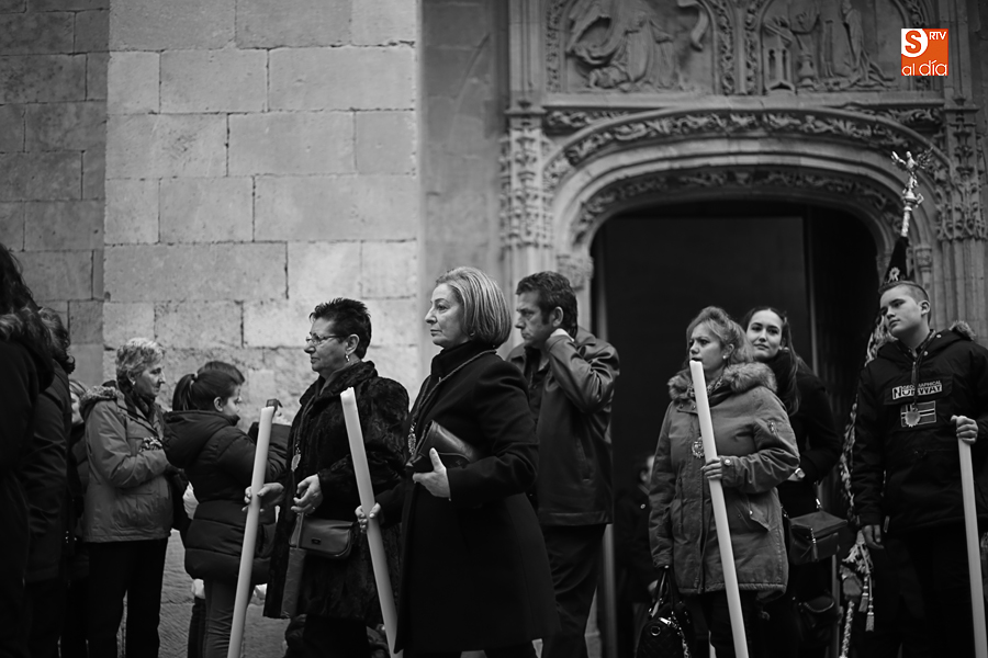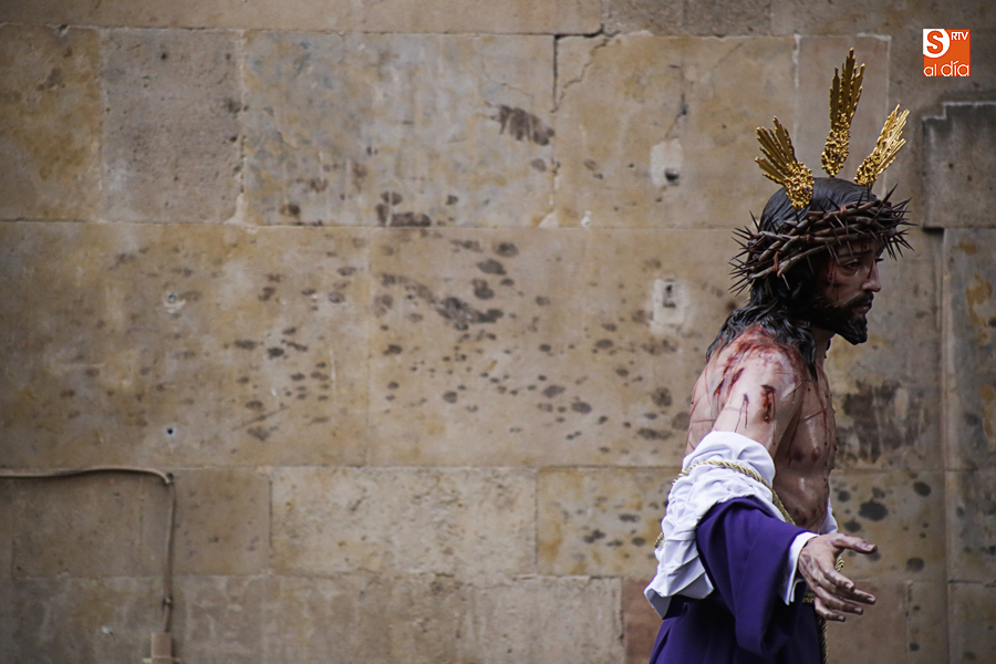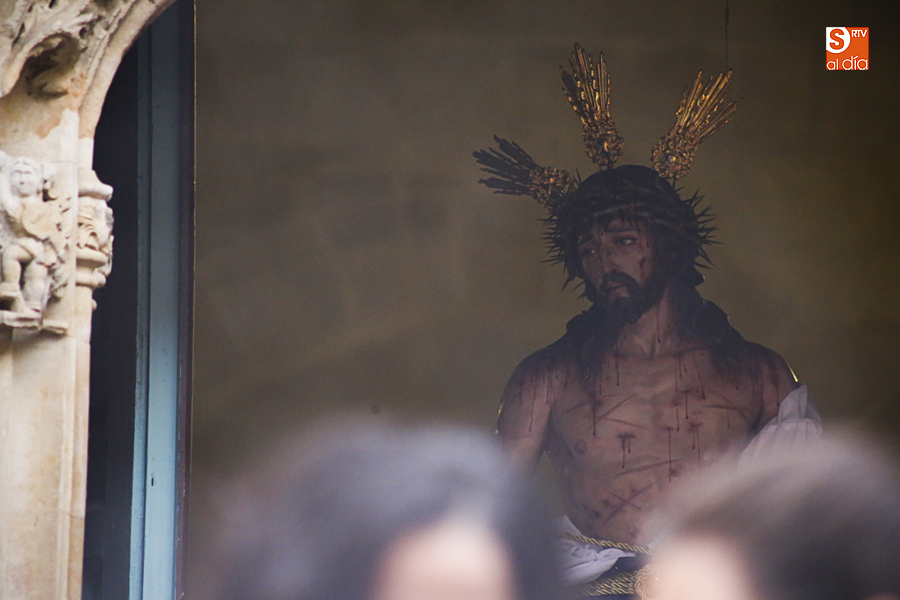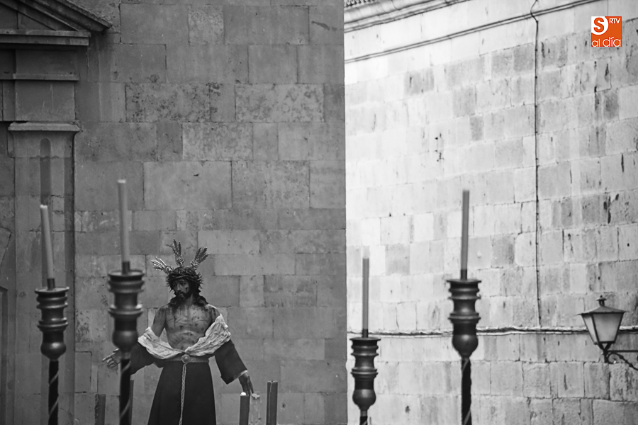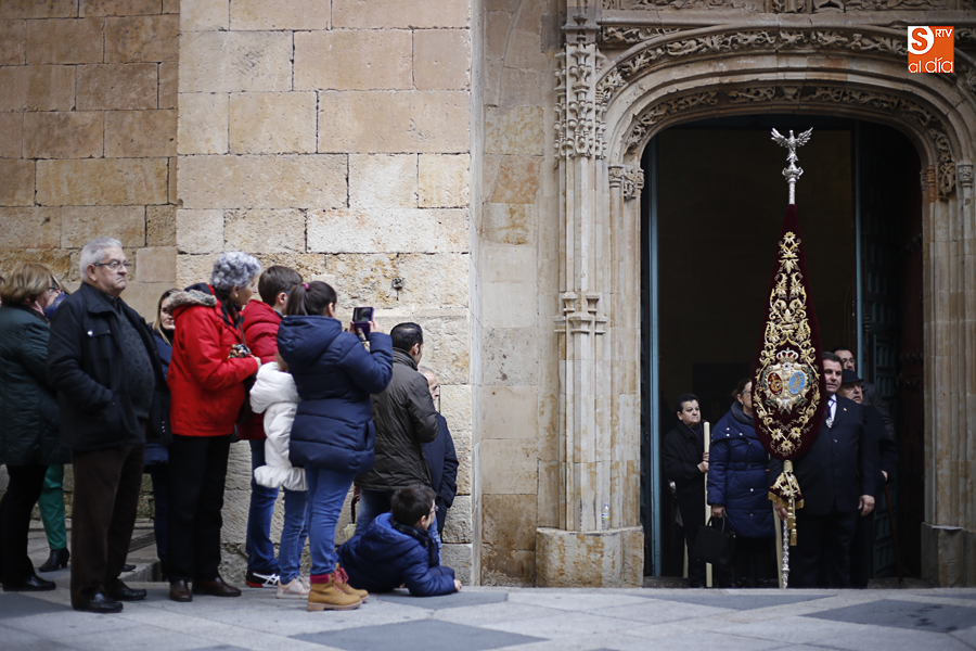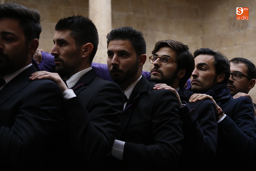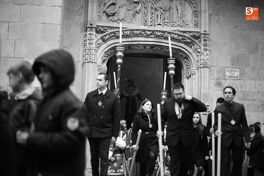 Amenazaba lluvia, pero, una vez más, la ilusión de lo que está por venir fue más fuerte. Se abrieron las puertas de la iglesia de San Benito y, tras el paso de velas, fieles y hermanos, una túnica morada se adivinaba entre el incienso. Comenzaron a caer unas tímidas gotas, pero, cuando el hombre de las vestiduras rasgadas besaba la piedra salmantina, el sol ganó el pulso. Y salieron a dar su primer paseo de Cuaresma el Despojado y su mirada, una mirada que empieza a fijarse en los cada vez más próximos días de Pasión.