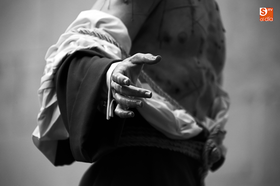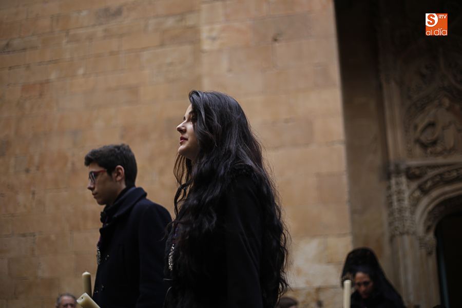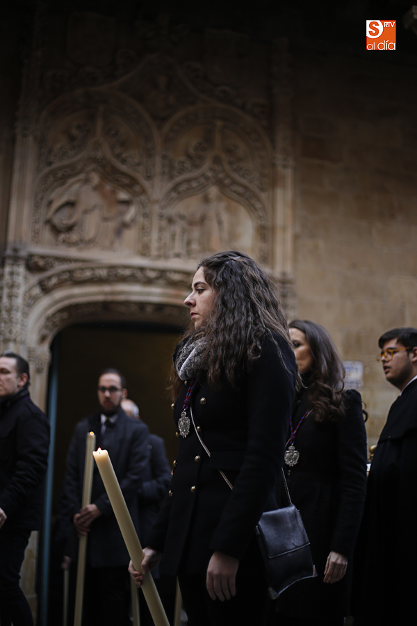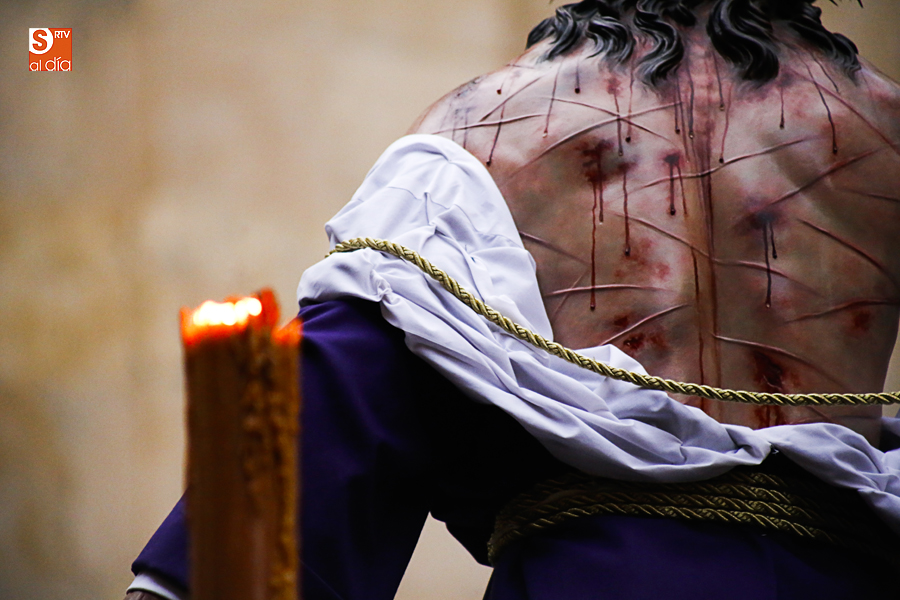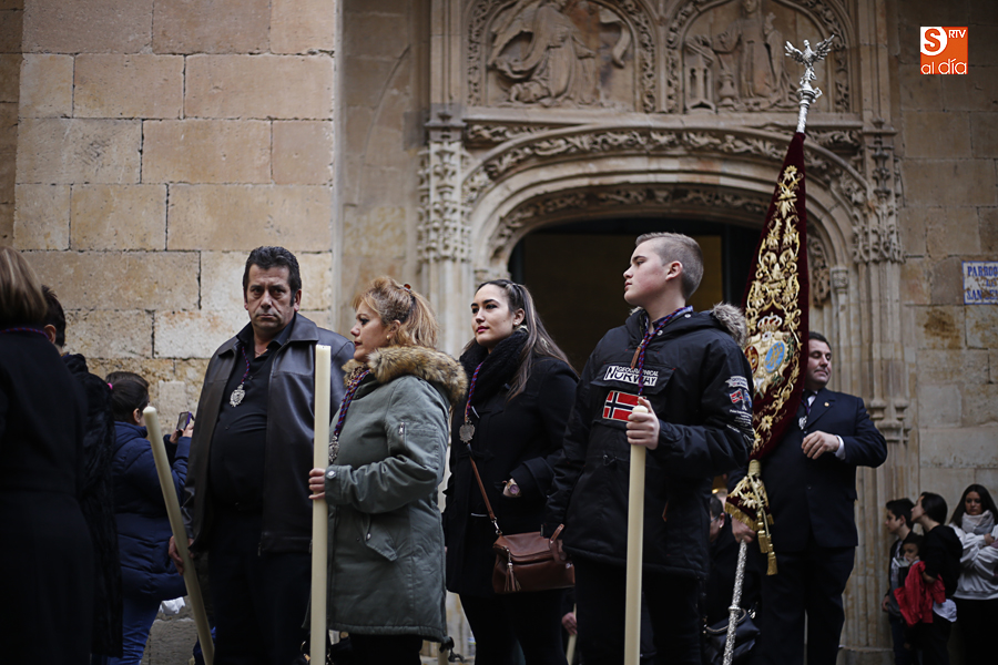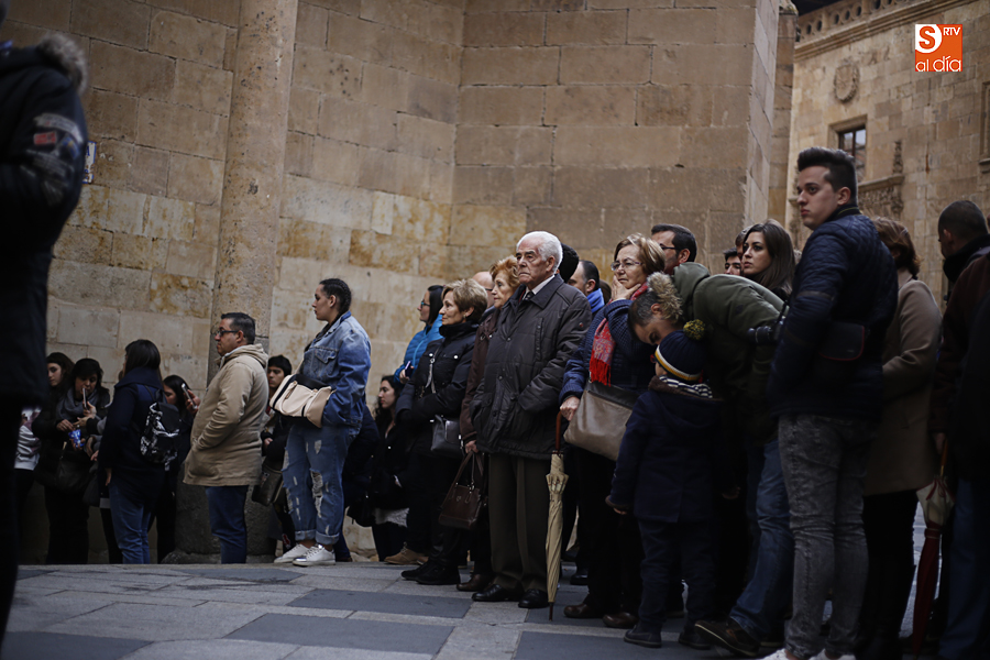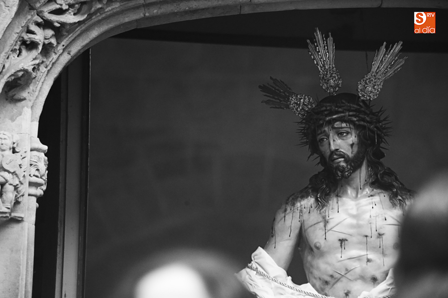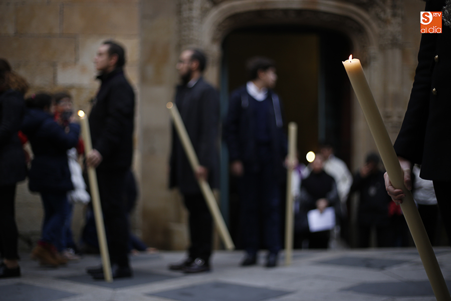 Amenazaba lluvia, pero, una vez más, la ilusión de lo que está por venir fue más fuerte. Se abrieron las puertas de la iglesia de San Benito y, tras el paso de velas, fieles y hermanos, una túnica morada se adivinaba entre el incienso. Comenzaron a caer unas tímidas gotas, pero, cuando el hombre de las vestiduras rasgadas besaba la piedra salmantina, el sol ganó el pulso. Y salieron a dar su primer paseo de Cuaresma el Despojado y su mirada, una mirada que empieza a fijarse en los cada vez más próximos días de Pasión.