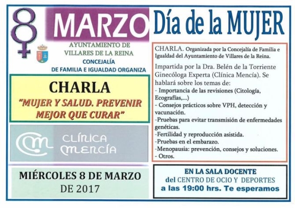 La Concejalía de Juventud, Familia e Igualdad del Ayuntamiento de Villares de la Reina, dentro de las actividades del 8 de marzo, Día de la Mujer, ha organizado junto con la doctora y ginecóloga Belén de la Torriente, de Clínica Mencía, una interesante charla sobre salud sexual y maternidad, que tendrá lugar en el Centro de Ocio y Deporte este miércoles a las 19 horas.
