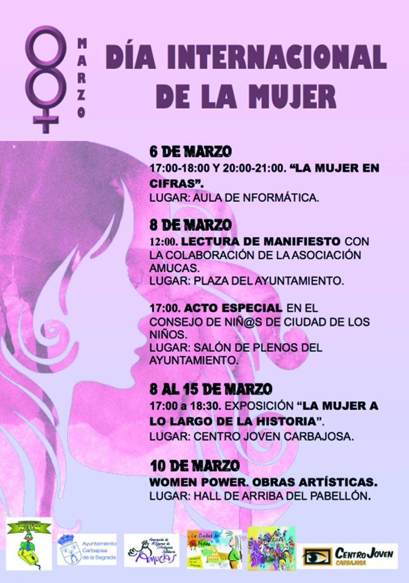 Con motivo del Día Internacional de la Mujer, el Ayuntamiento de Carbajosa de la Sagrada celebrará diferentes actos estos días, como la lectura pública del manifiesto que tendrá lugar mañana miércoles, día 8 de marzo, a las 12,00 horas en la Plaza del Ayuntamiento. En esta lectura colaborará, al igual que en años anteriores, la Asociación de Mujeres de Carbajosa Solidarias (AMUCAS).