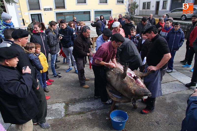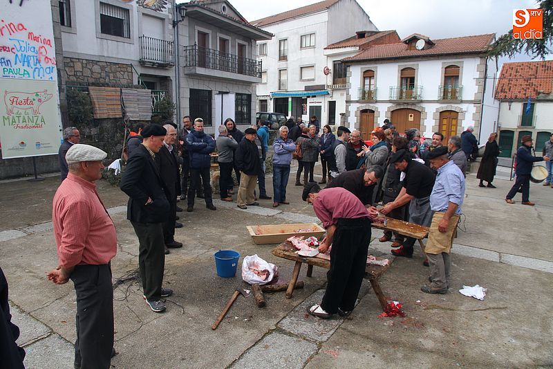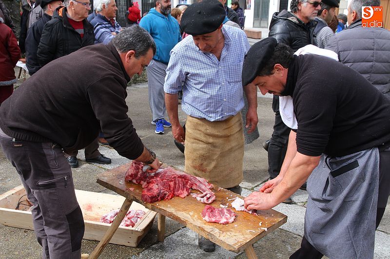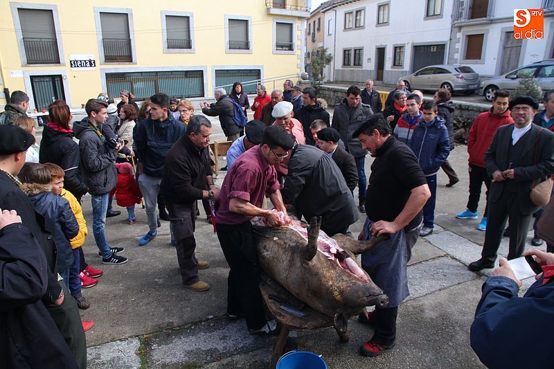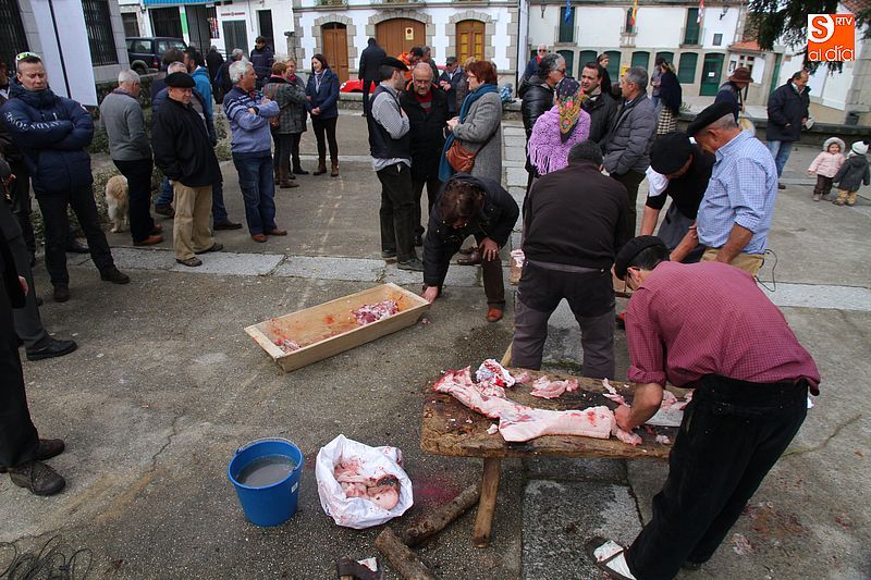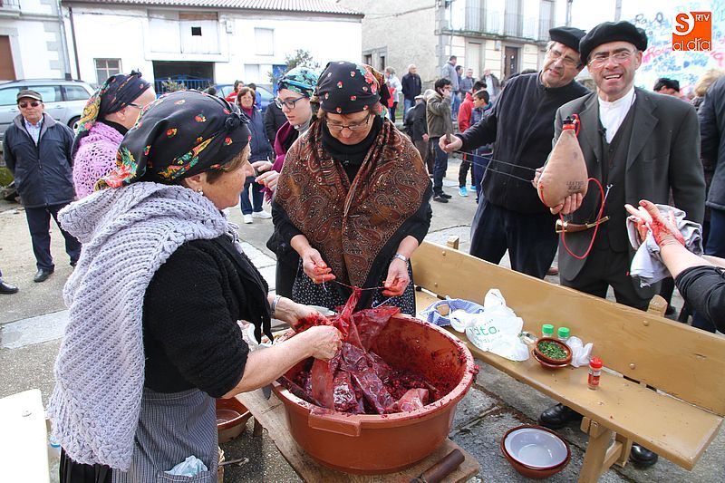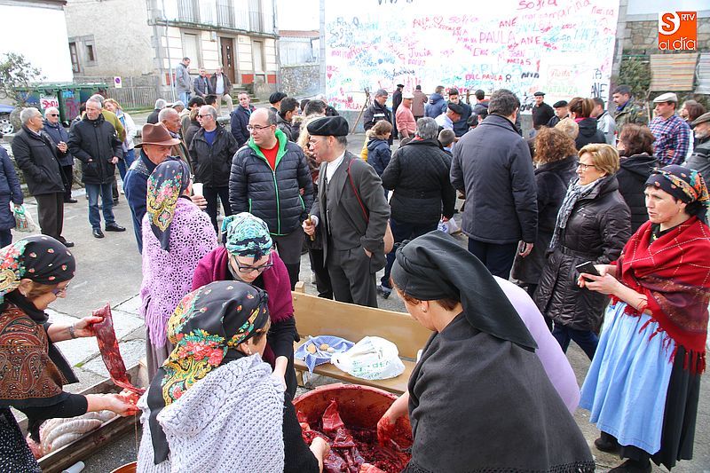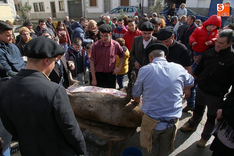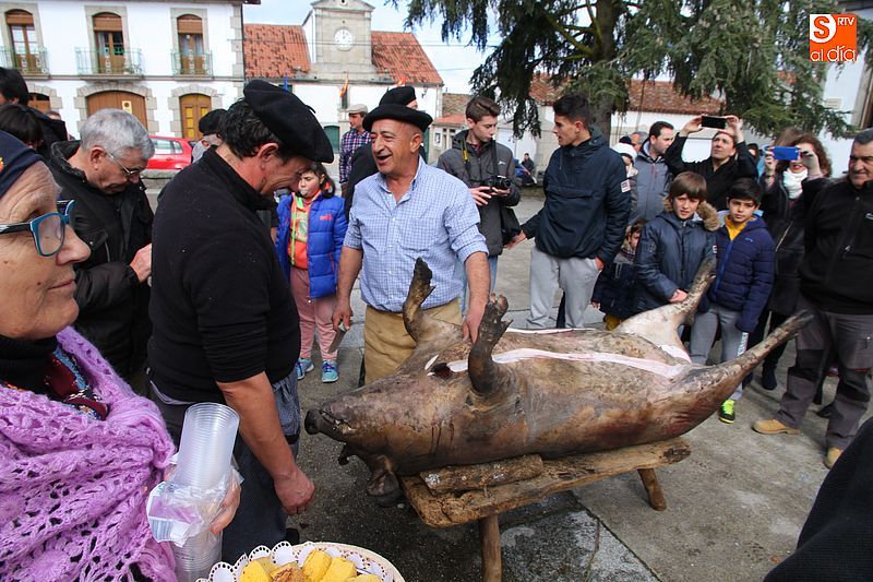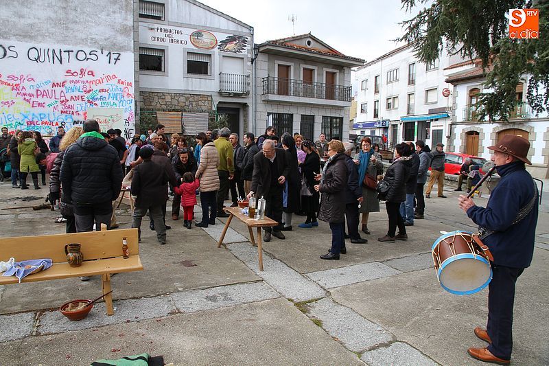 Los Santos vivió el pasado sábado una gran jornada con su Matanza Tradicional, incluida en el circuito de matanzas de la Diputación de Salamanca. Los actos comenzaron por la mañana con la tradicional puja del peso del cerdo en arrobas, en la que participaron decenas de personas a lo largo de la mañana. La primera degustación fue de aguardiente con dulces típicos, como es costumbre en las jornadas matanceras. A continuación, se chamuscó el cerdo y se procedió al despiece. Tal y como ha ocurrido en la mayor parte de las matanzas de la provincia, el cerdo llegó ya sacrificado a la plaza, por lo que se procedió directamente a las tareas de destazado. Los miembros de la Asociación Corral de Concejo, organizadora de la actividad, mostraron a los presentes el proceso de elaboración de morcilla. Al tiempo que se ofrecían nuevas degustaciones, como la de sopas de ajo. Con el cerdo ya despiezado, y con una gran temperatura en la plaza Mayor, se dio paso a la comida, con un menú de patatas revueltas con torreznos y carne asada. Por la tarde, los juegos infantiles y taller matanceros ocuparan a los presentes hasta la cena, antes del baile que cerrará la jornada. Por la tarde hubo tiempo para que se llevara a cabo un homenaje por el reciente fallecimiento de Javier Aparicio, vecino de la localidad que perdió la vida en un accidente de tráfico. Más de un centenar de personas se congregaron para guardar un minuto de silencio. A continuación, la charanga de la matanza interpretó 'Amparito Roca', el pasodoble preferido de Javier, trompetista aficionado que había llegado a formar parte de la Banda Municipal de Música de Béjar.