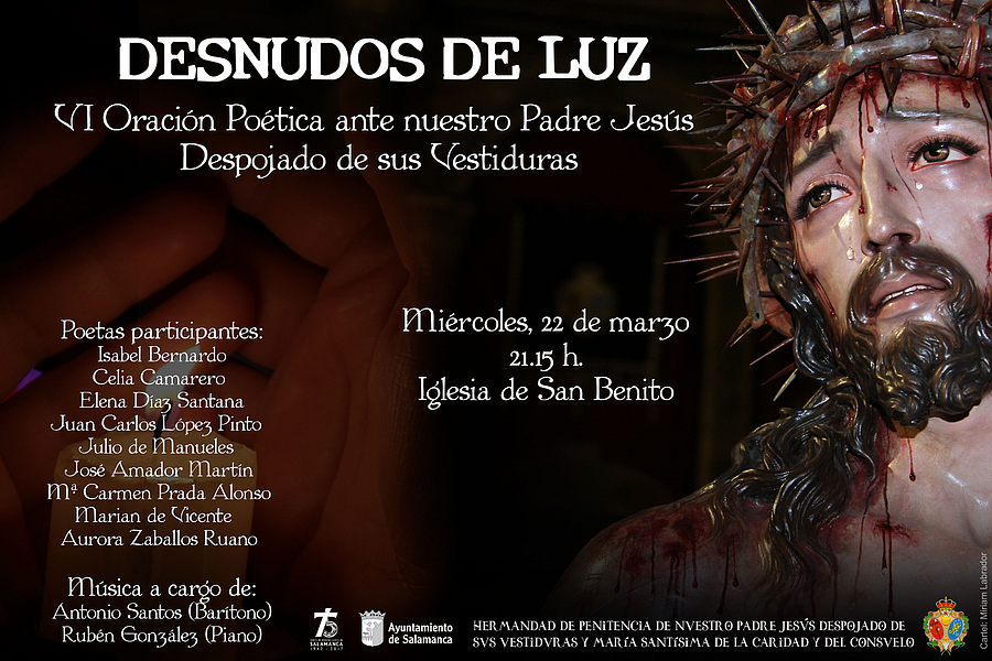 Un año más, la poesía, la música y el profundo silencio ante 'Jesús Despojado' se convertirán en el mejor pórtico de la Semana Santa salmantina este miércoles 22 de marzo (21,15 horas). Bajo el título o'Desnudos de luz', la iglesia de San Benito acoge la noche de esa jornada el recital 'Poesía de Oración ante Jesús Despojado' con la participación de diferentes poetas coordinados por la escritora Isabel Bernardo y con la colaboración de Antonio Santos (barítono) Rubén González (piano).