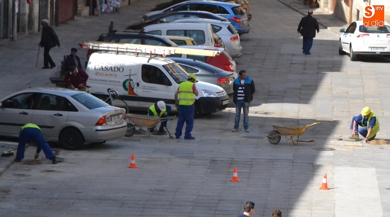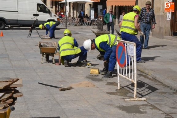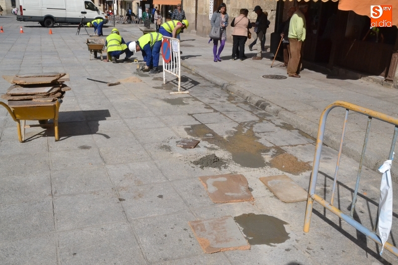 A lo largo de la mañana del miércoles, operarios del Ayuntamiento de Ciudad Rodrigo estuvieron trabajando en la reparación de los agujeros que se habían realizado hace unas semanas en la Plaza Mayor mirobrigense para colocar los anclajes de las barreras del coso taurino.