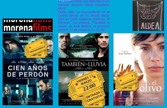 La primera de las proyecciones será la de También la lluvia, que tendrá lugar este viernes 17 de marzo a las 22.00 horas con entrada libre y gratuita. Esta película está dirigida por Icíar Bollaín, y cuenta como caras destacadas con Luis Tosar, Gael García Bernal y Karra Elejalde.