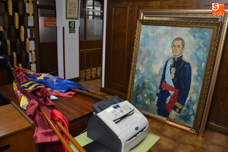 El rodaje de Red de Libertad toma la Casa Consistorial   | Imagen 1Como se puede ver en la imagen inferior, de ese salón se han retirado (llevándolos a otro punto del edificio) elementos fijos como las diversas banderas o los retratos de los Reyes, que evidentemente no encajan con la época en que está ambientada la película, en los inicios de la 2ª Guerra Mundial.