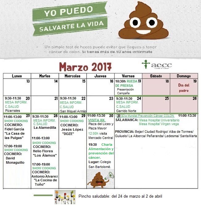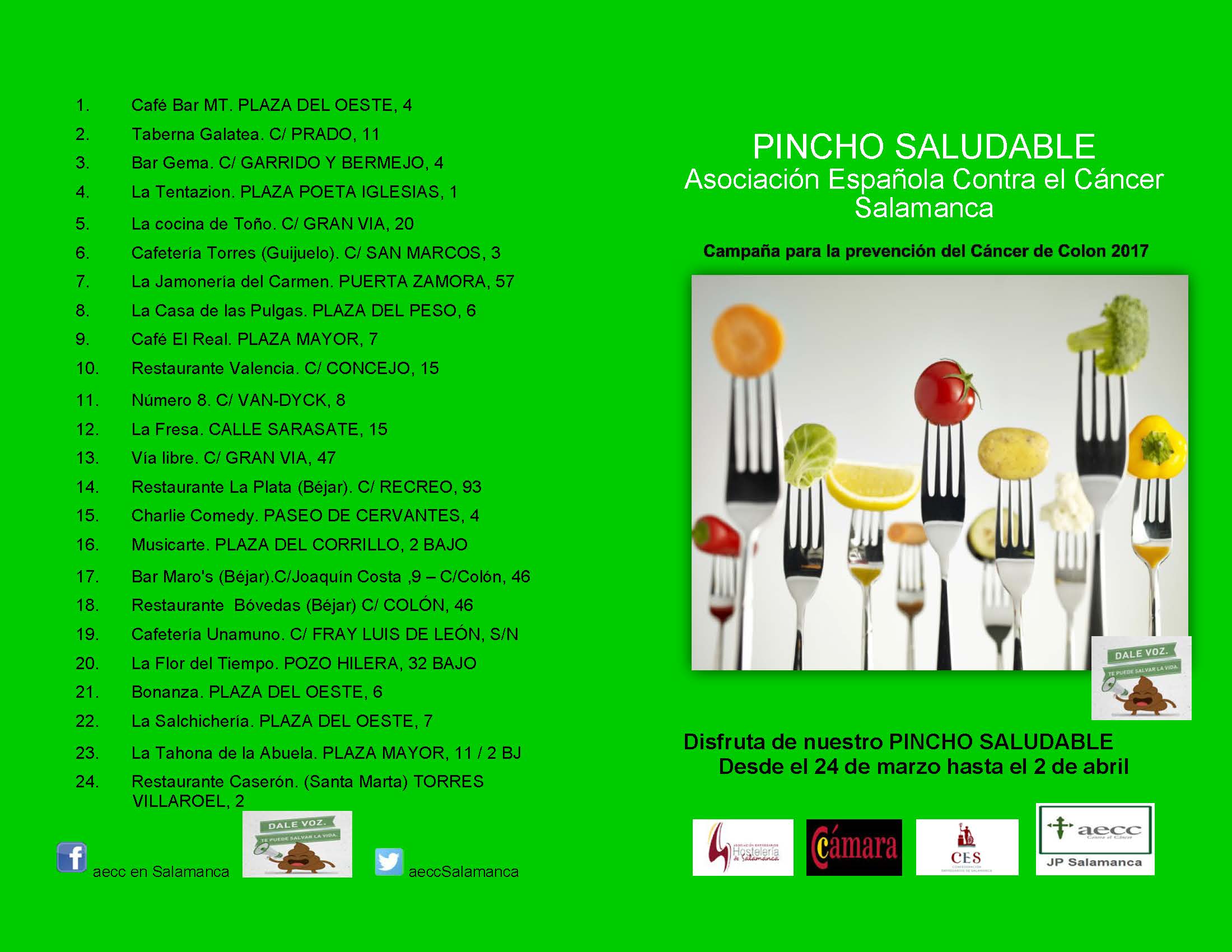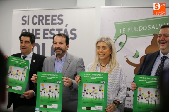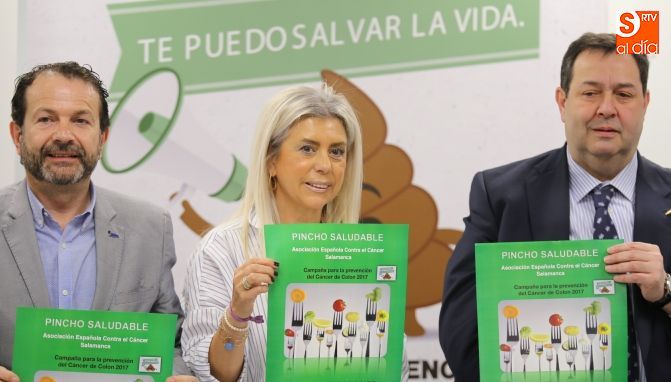 La AECC Salamanca ha presentado las actividades que se incluyen en la campaña contra el cáncer de colon, con motivo del Día Mundial que se celebra el 31 de marzo. La AECC quiere promover hábitos de vida saludables y cuenta con la colaboración de la Asociación de Hostelería, Cámara de Comercio y Confederación de empresarios de Salamanca. El fomento de la alimentación saludable como medio de prevención frente al cáncer de colon es uno de los objetivos de la segunda edición del "Pincho Saludable", del 24 de marzo al 2 de abril, resaltando la importancia del aumento en el consumo de frutas y verduras. Este año son 24 los establecimientos de la provincia, que integrados en la Asociación de Hostelería, dispondrán en sus bares-restaurantes de un pincho saludable.