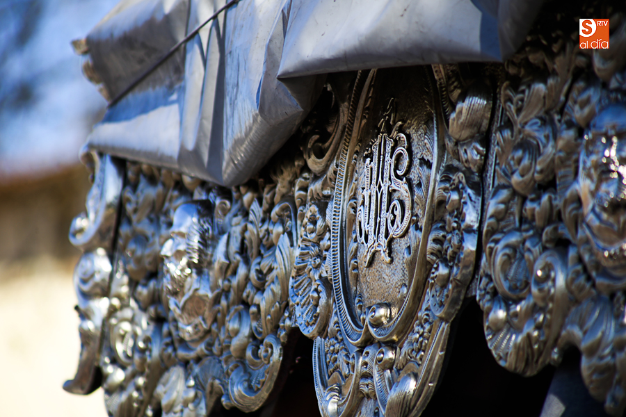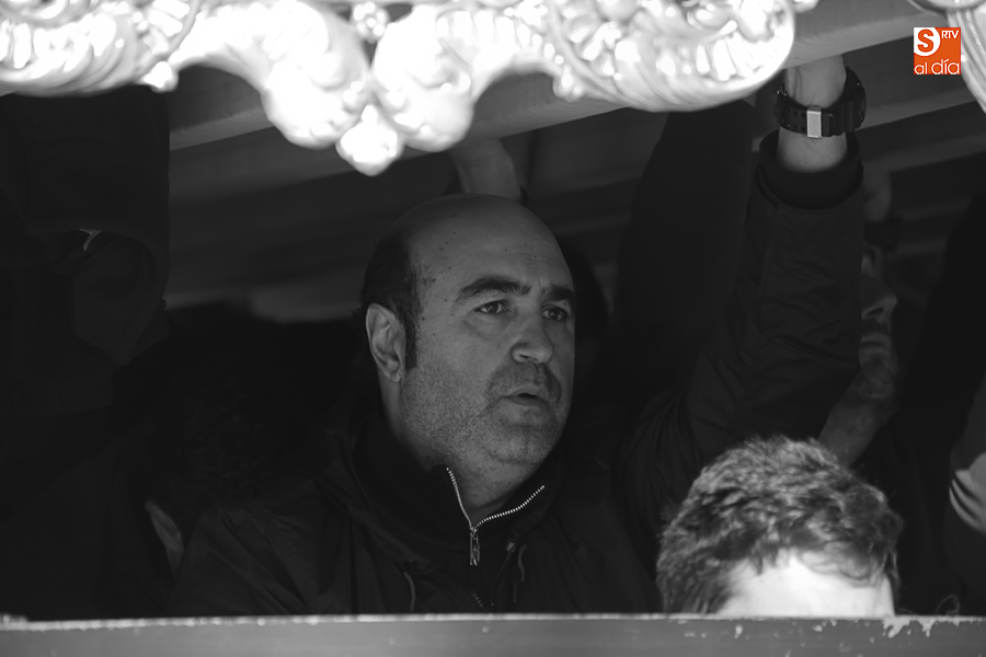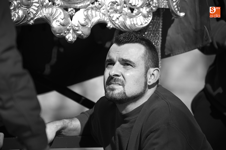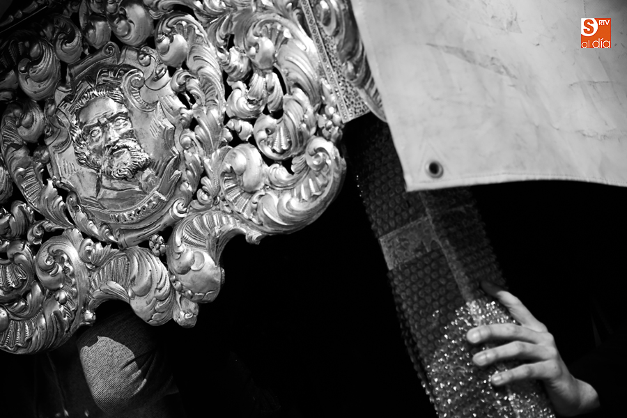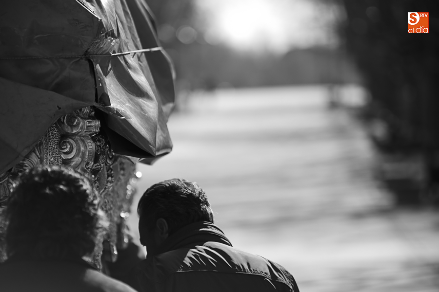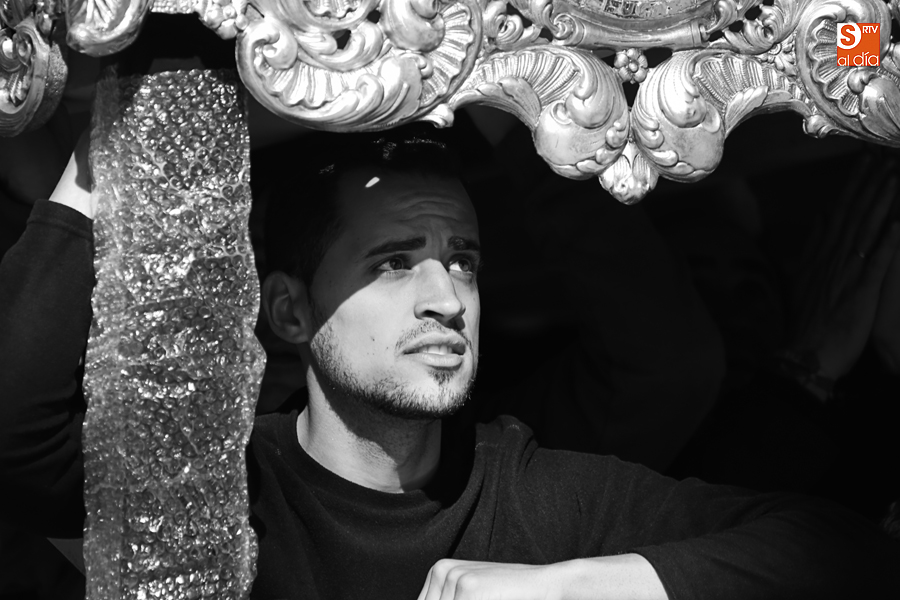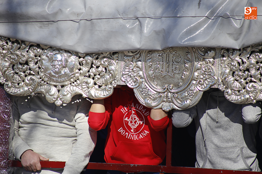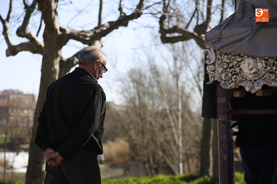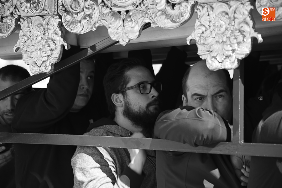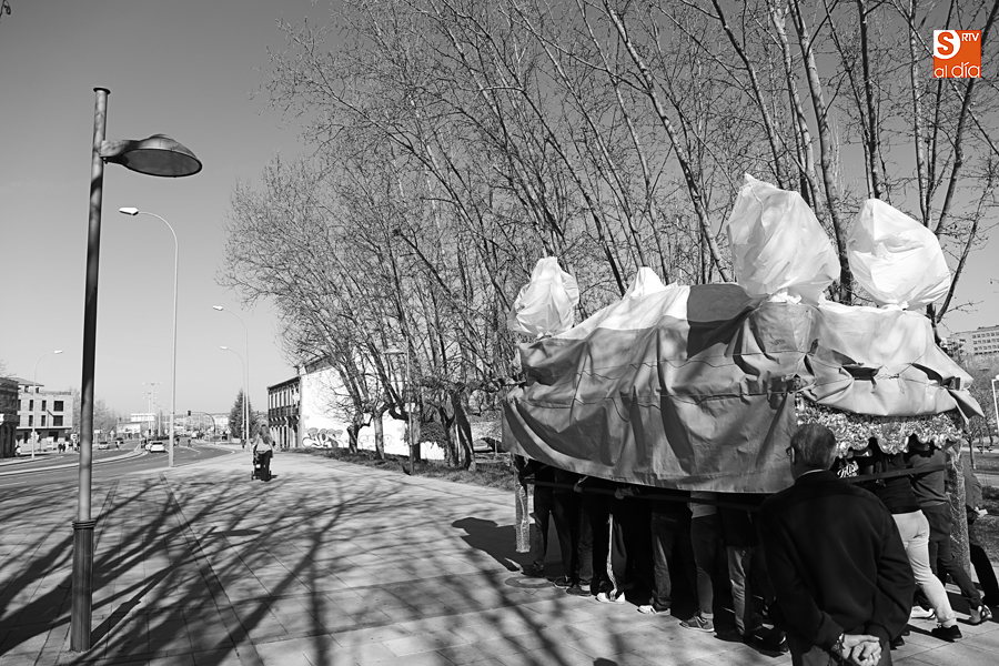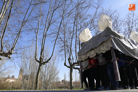 Despuntan los primeros rayos del sol de una casi primaveral mañana de domingo a orillas del Tormes y, como cada cuaresma, las puertas de la iglesia del Arrabal se abren para dar paso al esfuerzo, trabajo y pasión de los que van caminando precisamente hacia eso, la Pasión. Un ejemplo es el paso de Nuestra Señora de La Piedad, que ensaya ante la mirada de curiosos, con las Catedrales como fondo y testigo, el característico andar de la Madrugada salmantina.