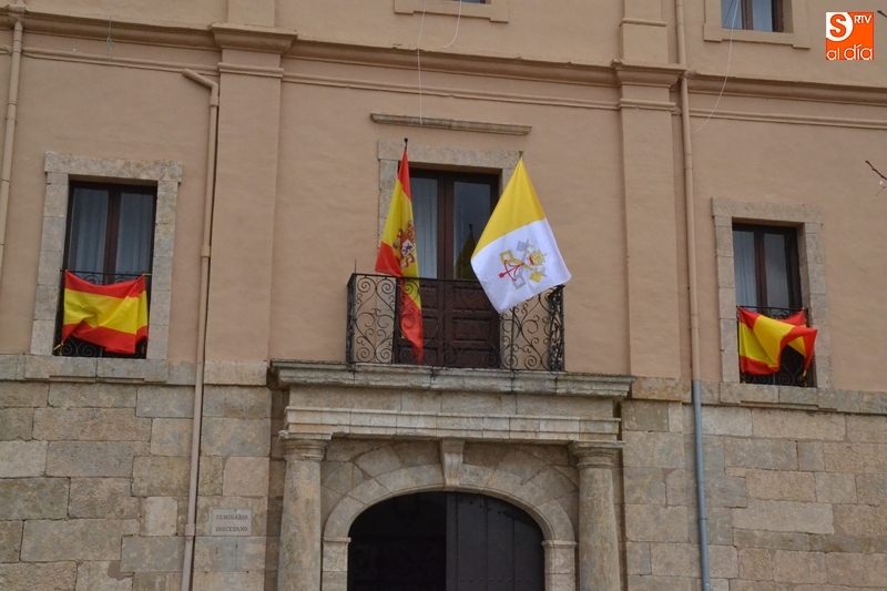 El Seminario Diocesano de San Cayetano de Ciudad Rodrigo luce desde el pasado viernes varias banderas en su fachada principal, algo novedoso en la institución. Por un lado, hay tres banderas de España (una de ellas de mayor tamaño), y por otro, una bandera de Ciudad del Vaticano, también conocida como bandera pontificia.