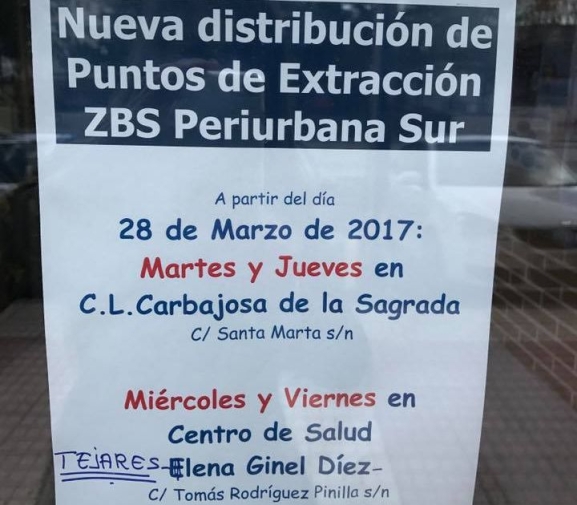 Con esta nueva distribución de los puntos de extracción de la Zona Básica de Salud Periurbana Sur, en la que se incluye Carbajosa de la Sagrada, los vecinos también tienen la opción de ser atendidos los miércoles y viernes en el centro de salud de Tejares.
