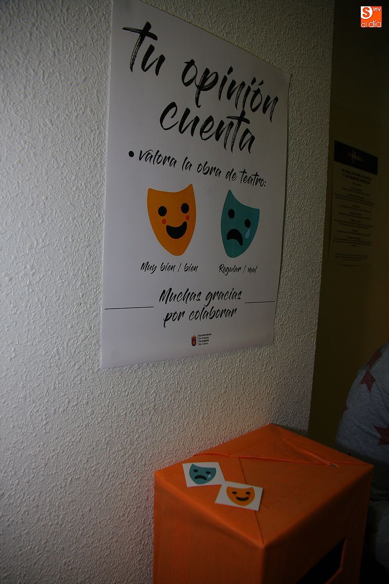 Además, para la ocasión, la Concejalía de Cultura estrenó varias novedades para el público del teatro. La primera de ellas es un sistema de evaluación para que el público califique las obras que se representen en la villa. A la salida del teatro se ha instalado un buzón y se pone a disposición del público la oportunidad de votar con una tarjeta, sonriente o triste, en función de si han disfrutado de la obra o no. Además, en esta ocasión se regalaron a los presentes unos broches con forma de máscaras teatrales, que fueron entregadas por la propia concejala de Cultura, María Jesús Moro.