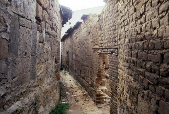 En la imagen de Santiago Bayón Vera, columnista de SALAMANCArtv AL DÍA, la callejuela ruinosa que antaño unía las calles Carnicería y de la Iglesia (1983). Abajo, Cantalpino en 1986 desde el campanario de la Iglesia, en cuya puerta principal aparece la efigie de San Pedro, titular del templo, que aparece debajo.