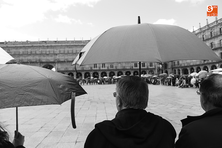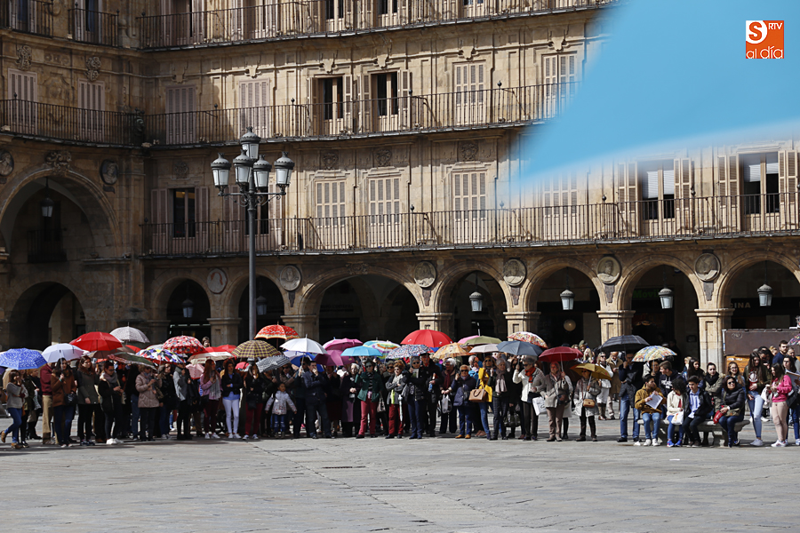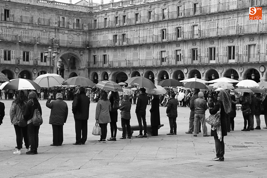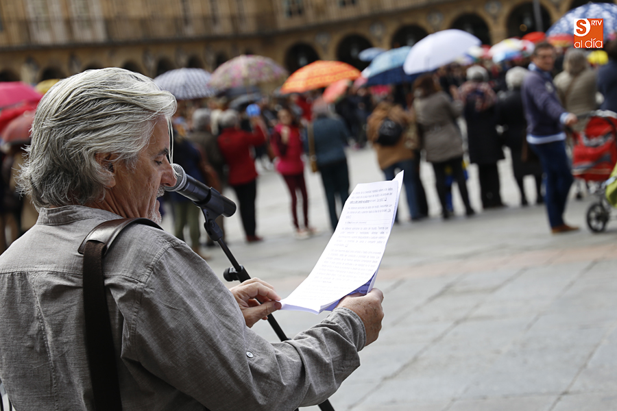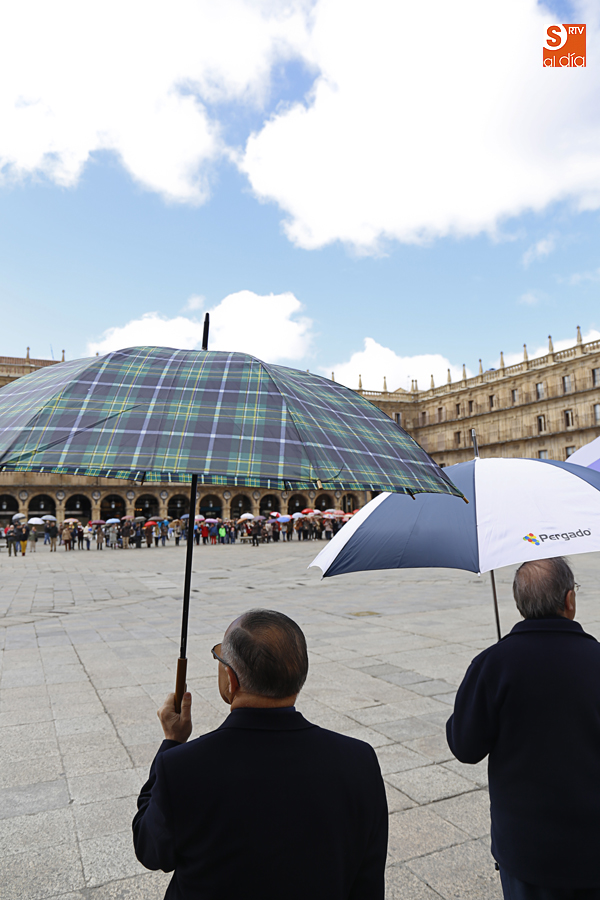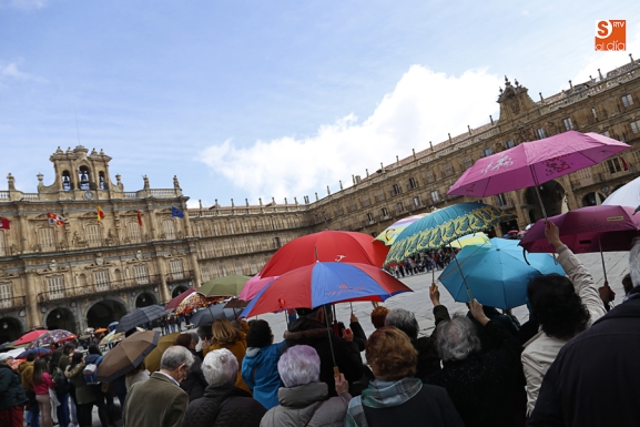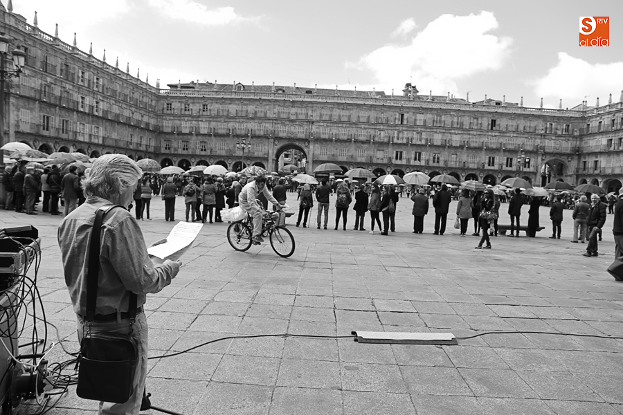 La Plaza Mayor de Salamanca ha acogido este sábado una de las actividades de sensibilización de Manos Unidas ya arraigadas en Salamanca, el 'Abrazo solidario', que este año cumple su octava edición. El propósito de esta iniciativa es interpelar a la sociedad salmantina sobre la injusticia, desigualdad y subdesarrollo que padecen muchas poblaciones del sur y al mismo tiempo "promover un compromiso y concienciación para invertir la situación. En cada cambio de actitud, individual y colectiva, está la llave para empezar a hacer un mundo más justo". Un abrazo a los 88 arcos de la Plaza en torno a la idea común de clamar por un mundo mejor para aquellos que tienen menos.
