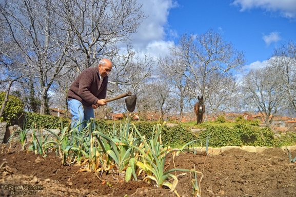 Todo se mueve aquí en un juego de líneas y de luces. Y el hombre con la azada, ahora que el tiempo nuevo ya comienza, laborea el terruño muy atento, con una entrega antigua a la raíz, al mundo, porque de su labor depende la existencia de los frutos y por