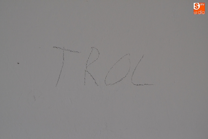 Desgraciadamente, las paredes recién pintadas han durado poco impolutas, ya que unos gamberros han realizado unos garabatos (no llegan al calificativo de pintadas) en la zona central de la parte pintada de los soportales.
