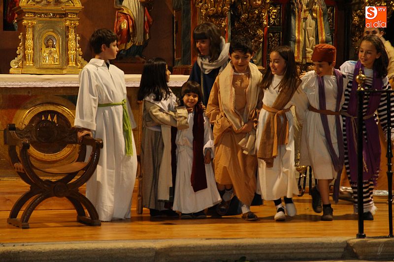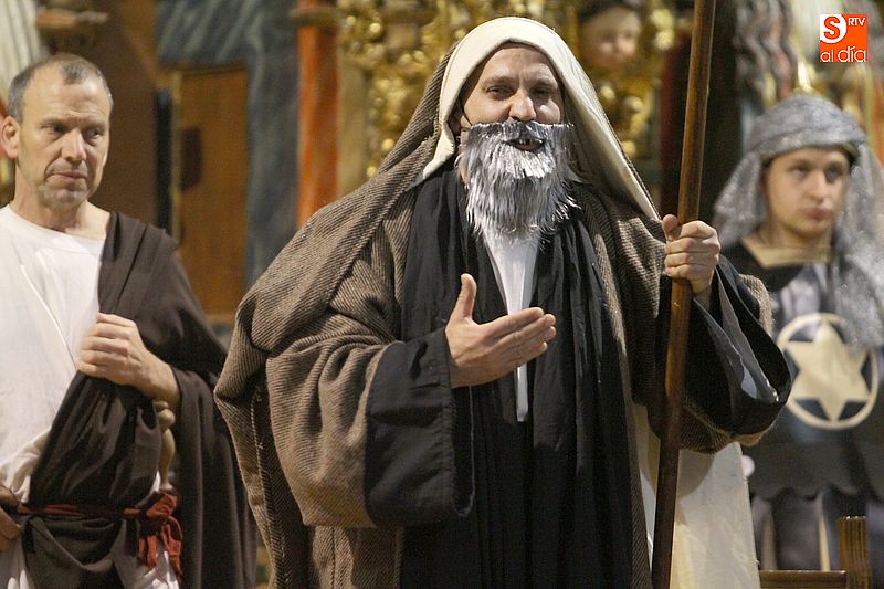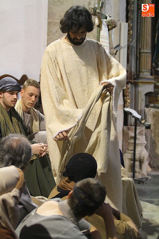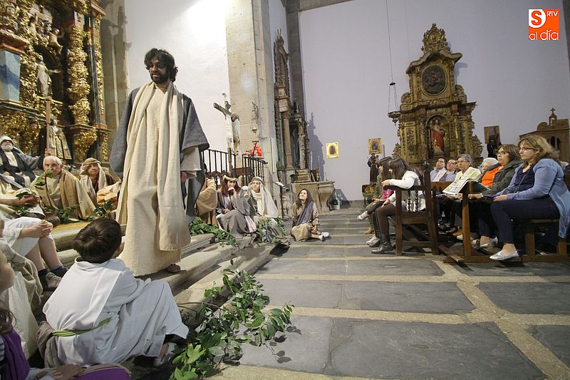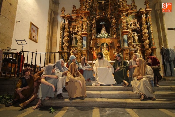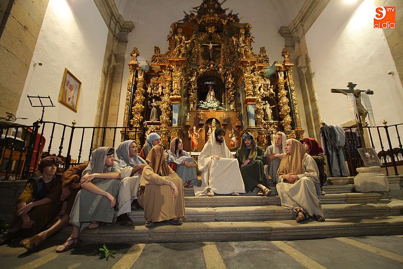 La iglesia parroquial de Mogarraz acogió ayer la tercera edición de la muestra de La Pasión en Mogarraz. La asociación trasladó a casi medio centenar de actores de todas las edades hasta el templo para ofrecer la representación de las primeras escenas del episodio evangélico. El templo rozó el lleno con unas 150 personas de público, que presenciaron escenas de Jesucristo predicando, la última cena junto a los apóstoles, la traición de Judas o su detención por l