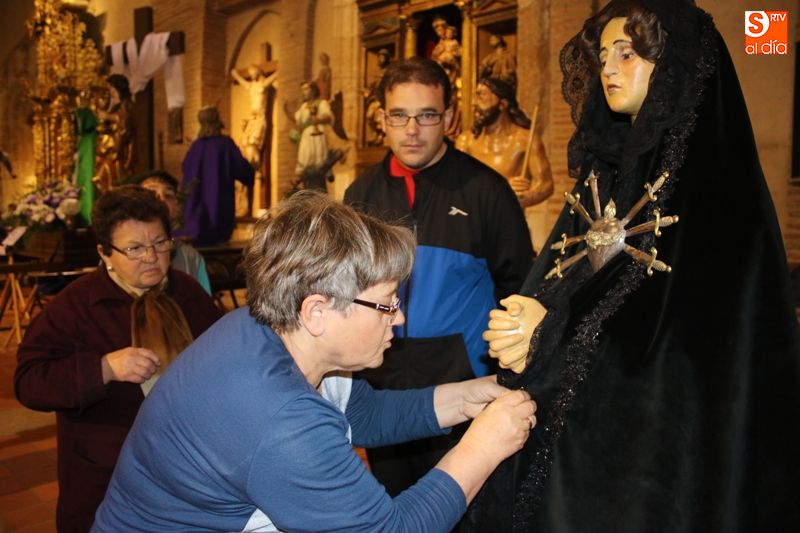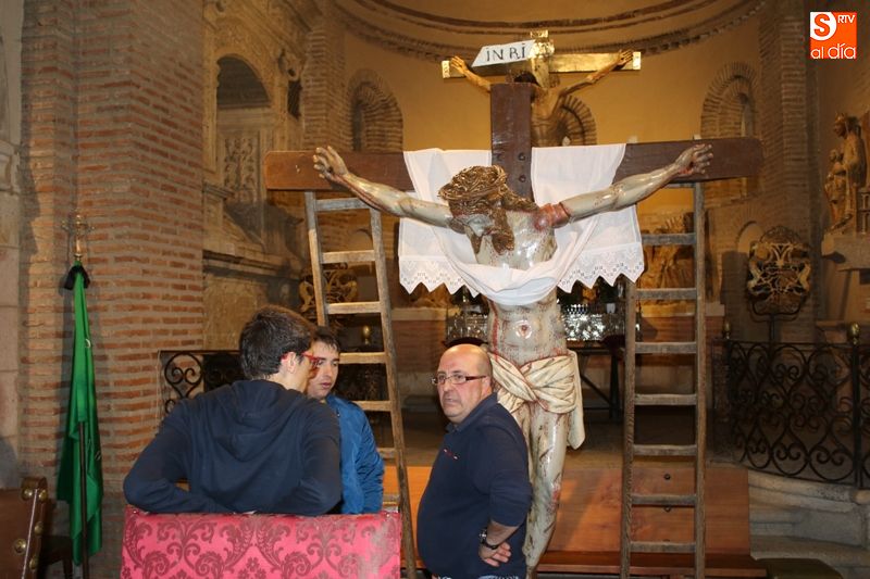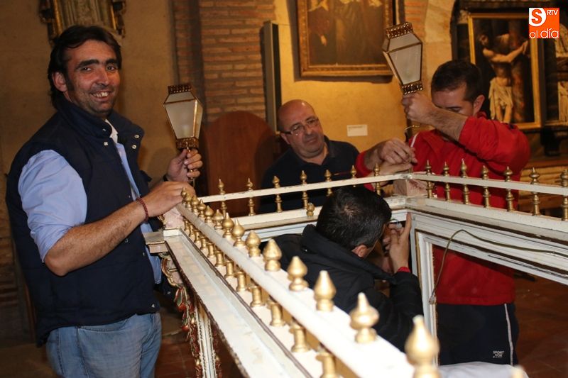 Como es habitual dedicaron la mañana del Jueves Santo a la preparación de los pasos procesionales que hoy protagonizarán la tarde y la noche del Viernes Santo. Esta mañana de labor y trabajo para los cofrades de la Vera Cruz pasa desapercibida para los vecinos pero resulta fundamental cada año para el mantenimiento y lucimiento de las imágenes durante la Semana Santa.