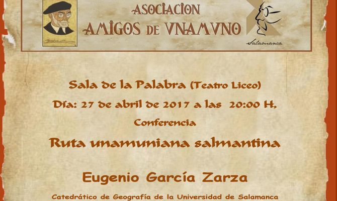 Día 27 de abril, jueves.- A las 20:00 horas, en la Sala de la Palabra (Teatro Liceo), la asociación ofrecerá una interesante conferencia que lleva por título 'Ruta unamuniana salmantina' que será impartida por Eugenio García Zarza, catedrático de Geografía de la Universidad de Salamanca. La presentación correrá a cargo de Luis Andrés Marcos, vicepresidente de la asociación.