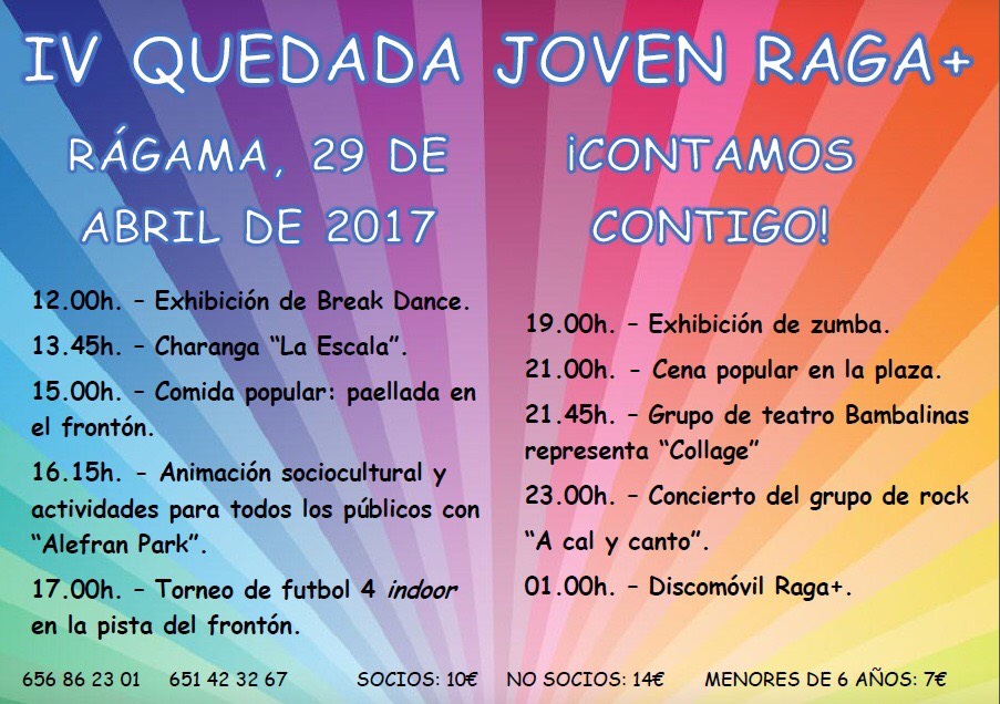 El precio de inscripción es de 10 ? para los miembros de la asociación y de 14 ? para los no socios, previéndose un precio especial de 7 ? para los menores de 6 años. La misma podrá hacerse a través de la página de Facebook de la Asociación (AJC Raga+), del correo electrónico (ragamas.asociacion@hotmail.com) y contactando con los miembros de la Junta Directiva cuyos teléfonos aparecen en el programa.