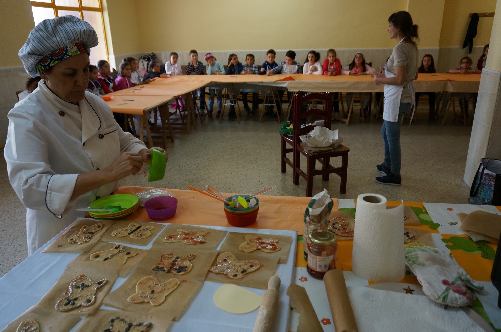 Con una alta participación de niño/as de 4 a 14 años, tras las instrucciones de las cocineras Marga & Rosa, el medio centenar de participantes en grupos de 25, ha realizado una mariposa partiendo de una masa ya detallada con esa forma y que han decorado con fruta y semillas, dando lugar a toda una "cosecha" de mariposas poéticas.