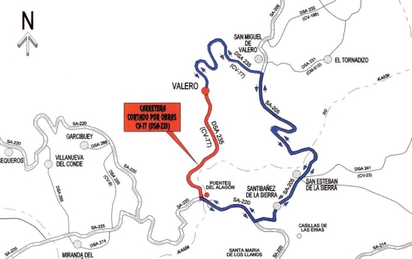 La Diputación de Salamanca continúa con el desarrollo del Plan Provincial de Carreteras, que llega de nuevo a la Sierra de Francia. La carretera CV77 (DSA-235 ), que une Valero con los Puentes del Alagón, ha sido cortada el pasado miércoles al tráfico y permanecerá cerrada hasta el próximo 15 de diciembre. Para los desplazamientos entre ambos puntos se recomienda el itinerario alternativo a través de los municipios de Santibáñez de la Sierra y San Esteban de la Sierra.