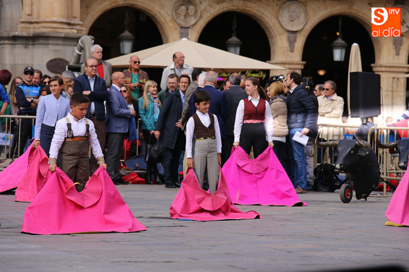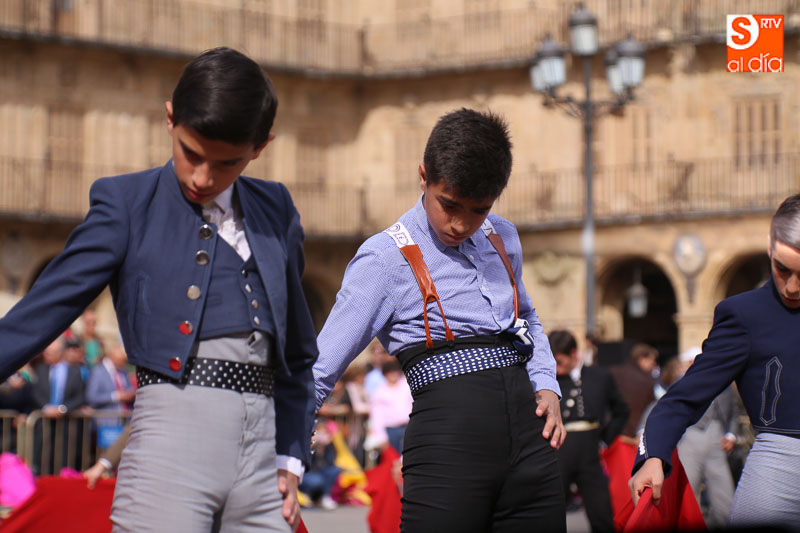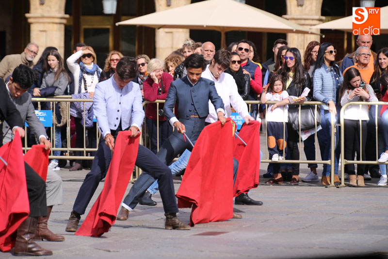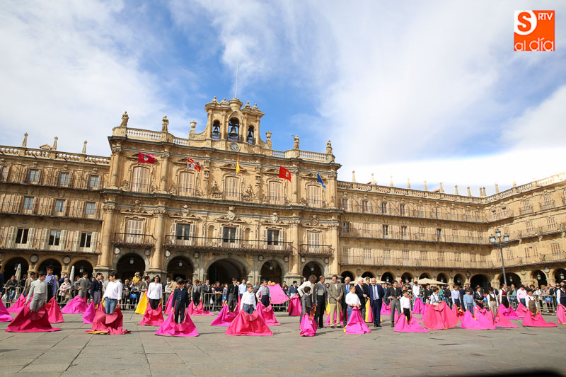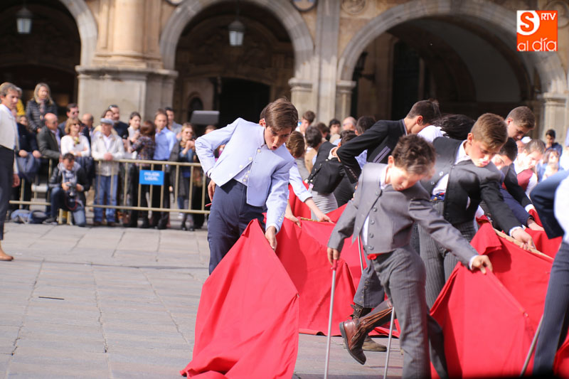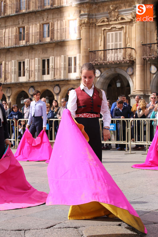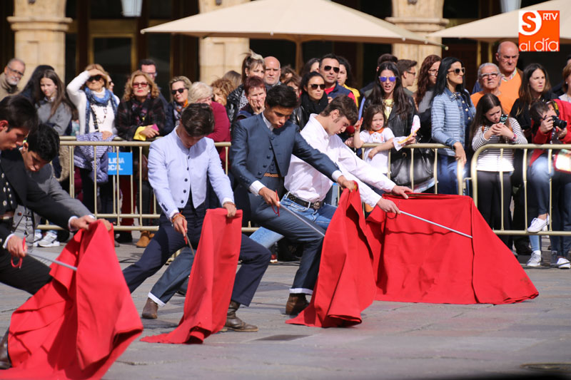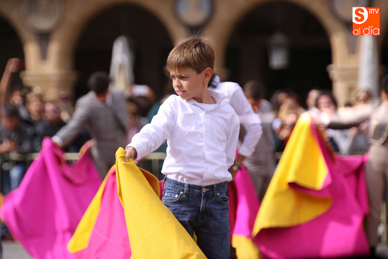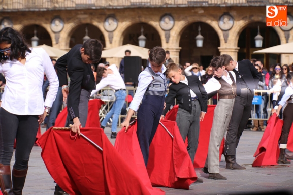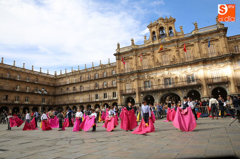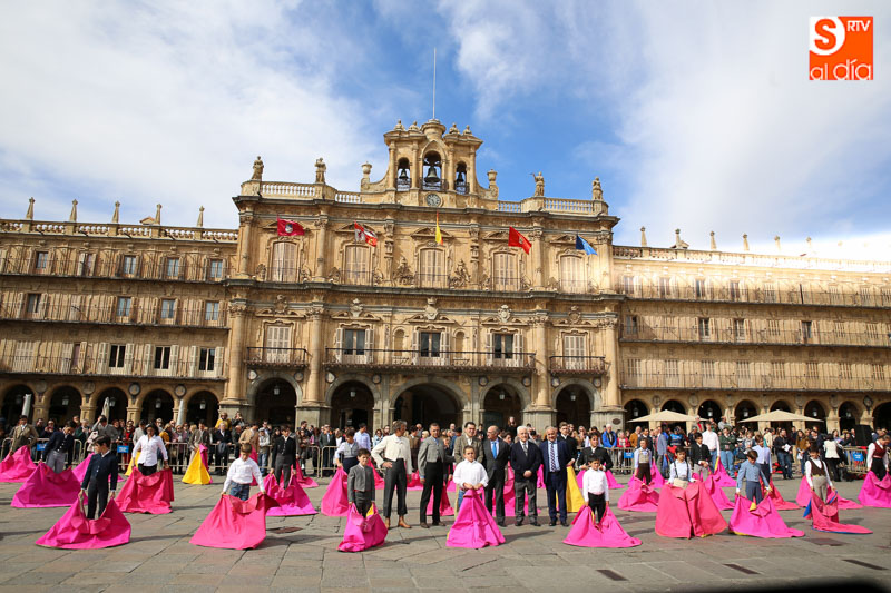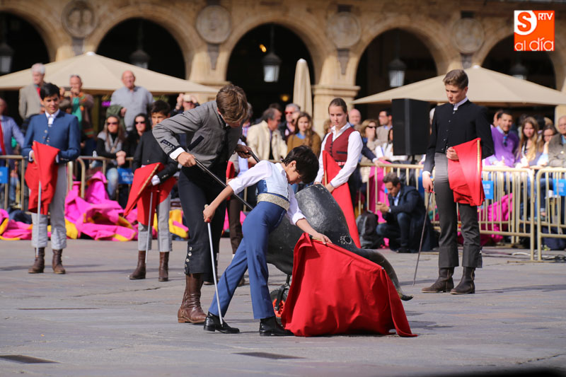 El secretario general de la Consejería de Cultura y Turismo, José Rodríguez Sanz-Pastor, junto con el presidente de la Diputación de Salamanca, Javier Iglesias, y al maestro salmantino Santiago Martín 'El Viti', ha asistido esta tarde a una exhibición de toreo de salón por parte de los alumnos de la Escuela de Tauromaquia de Salamanca. La Plaza Mayor ha sido el escenario en el que cerca de un centenar de participantes han mostrado al público sus destrezas adquiridas durante su formación y al ritmo de música clásica han realizado de forma acompasada diferentes suertes del toreo con capote y muleta.