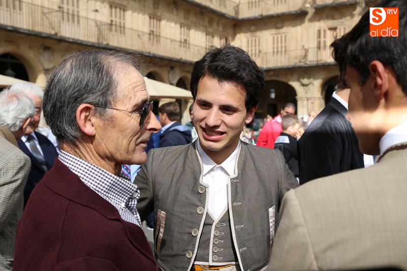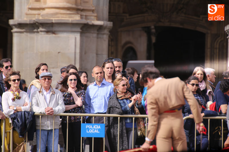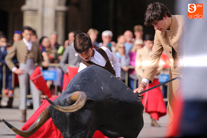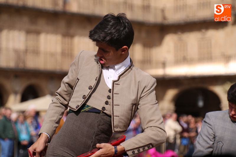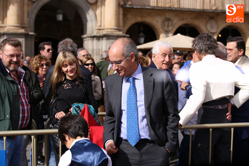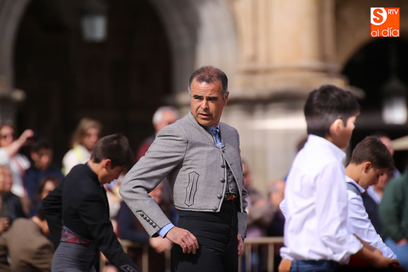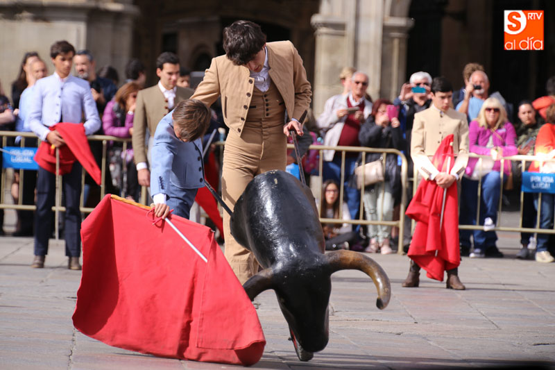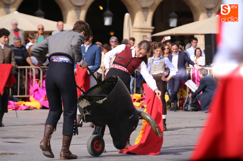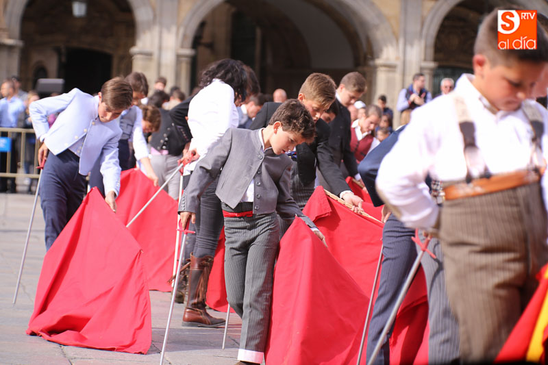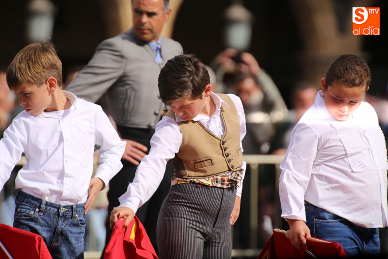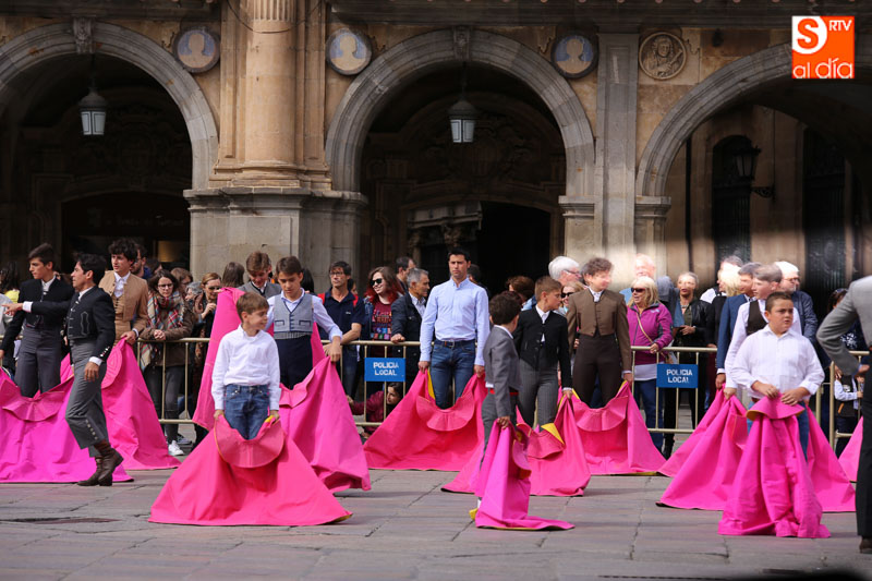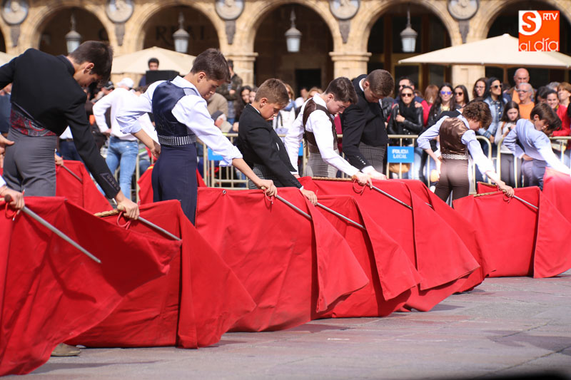El secretario general de la Consejería de Cultura y Turismo, José Rodríguez Sanz-Pastor, junto con el presidente de la Diputación de Salamanca, Javier Iglesias, y al maestro salmantino Santiago Martín 'El Viti', ha asistido esta tarde a una exhibición de toreo de salón por parte de los alumnos de la Escuela de Tauromaquia de Salamanca. La Plaza Mayor ha sido el escenario en el que cerca de un centenar de participantes han mostrado al público sus destrezas adquiridas durante su formación y al ritmo de música clásica han realizado de forma acompasada diferentes suertes del toreo con capote y muleta.