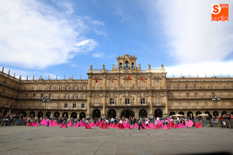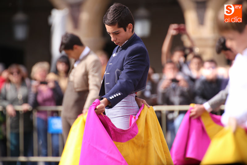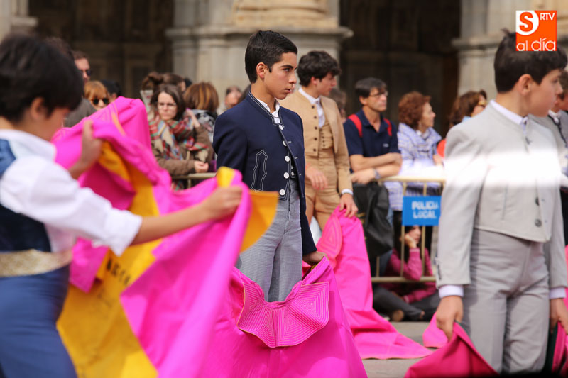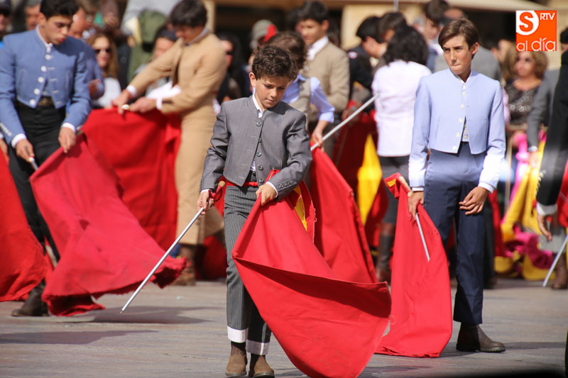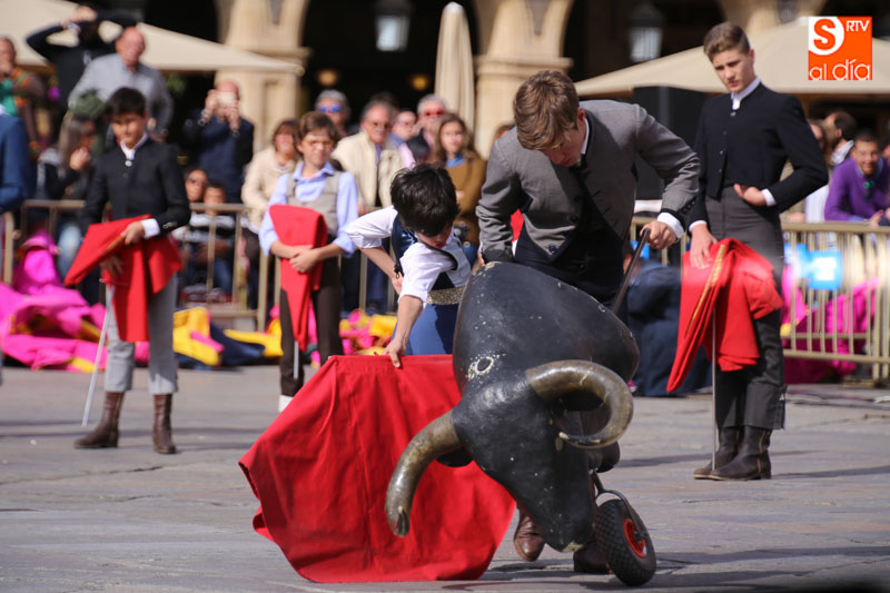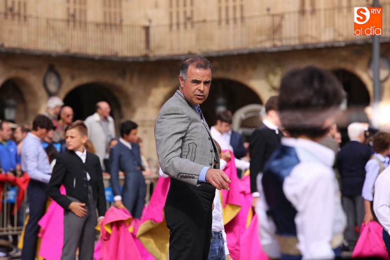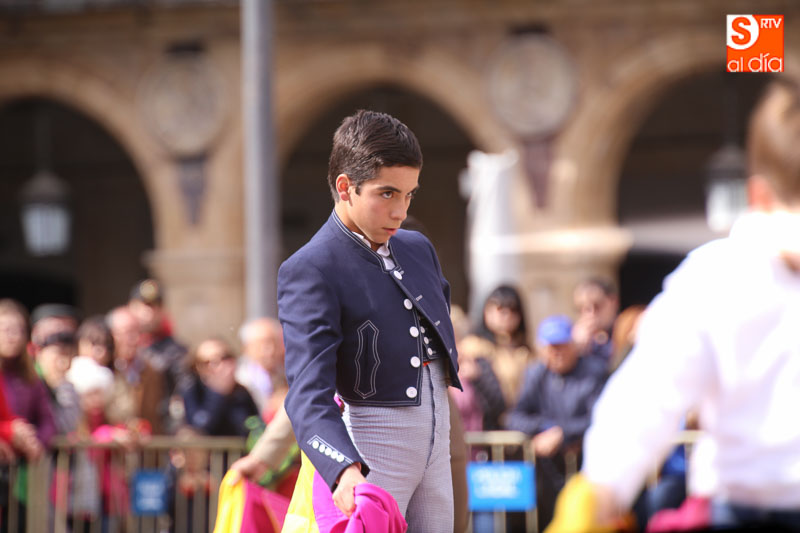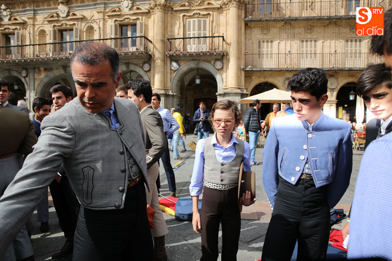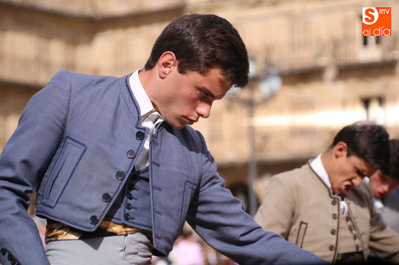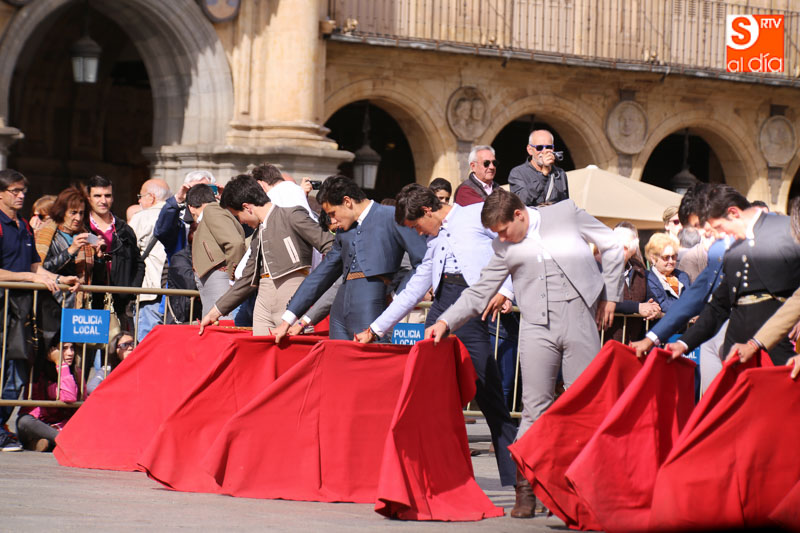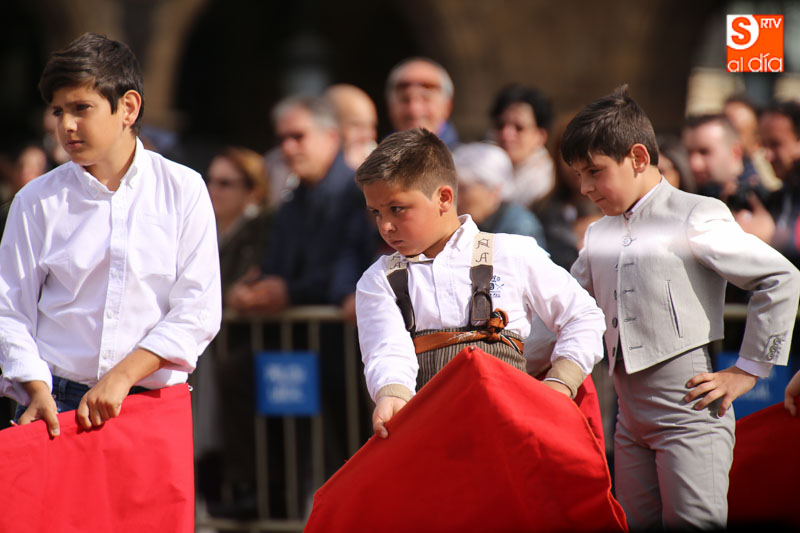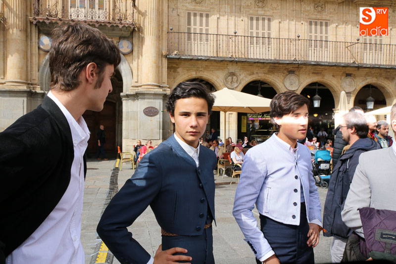 El secretario general de la Consejería de Cultura y Turismo, José Rodríguez Sanz-Pastor, junto con el presidente de la Diputación de Salamanca, Javier Iglesias, y al maestro salmantino Santiago Martín 'El Viti', ha asistido esta tarde a una exhibición de toreo de salón por parte de los alumnos de la Escuela de Tauromaquia de Salamanca. La Plaza Mayor ha sido el escenario en el que cerca de un centenar de participantes han mostrado al público sus destrezas adquiridas durante su formación y al ritmo de música clásica han realizado de forma acompasada diferentes suertes del toreo con capote y muleta.