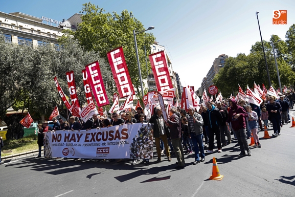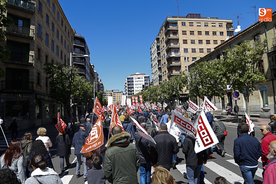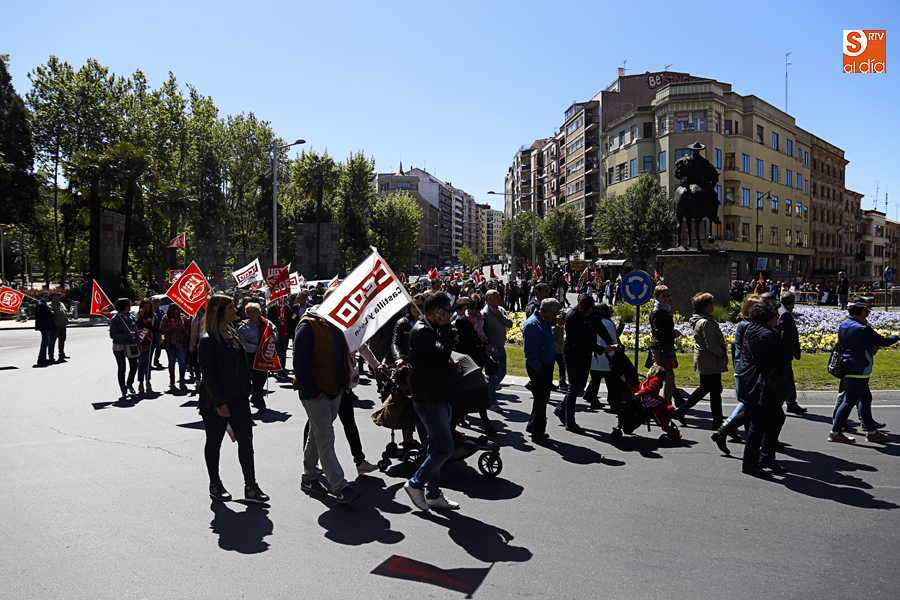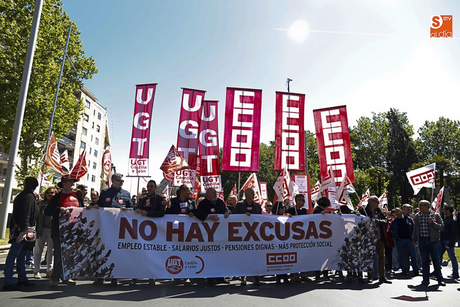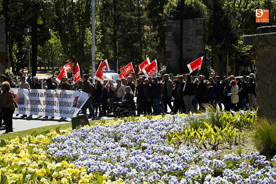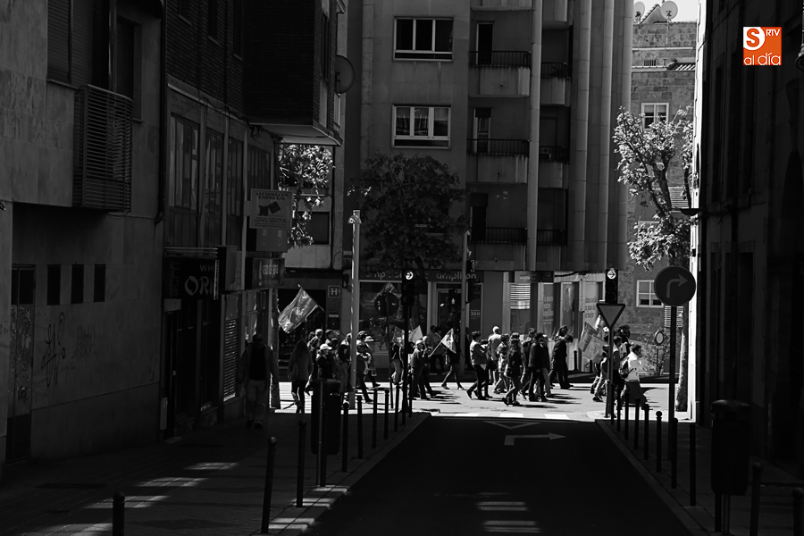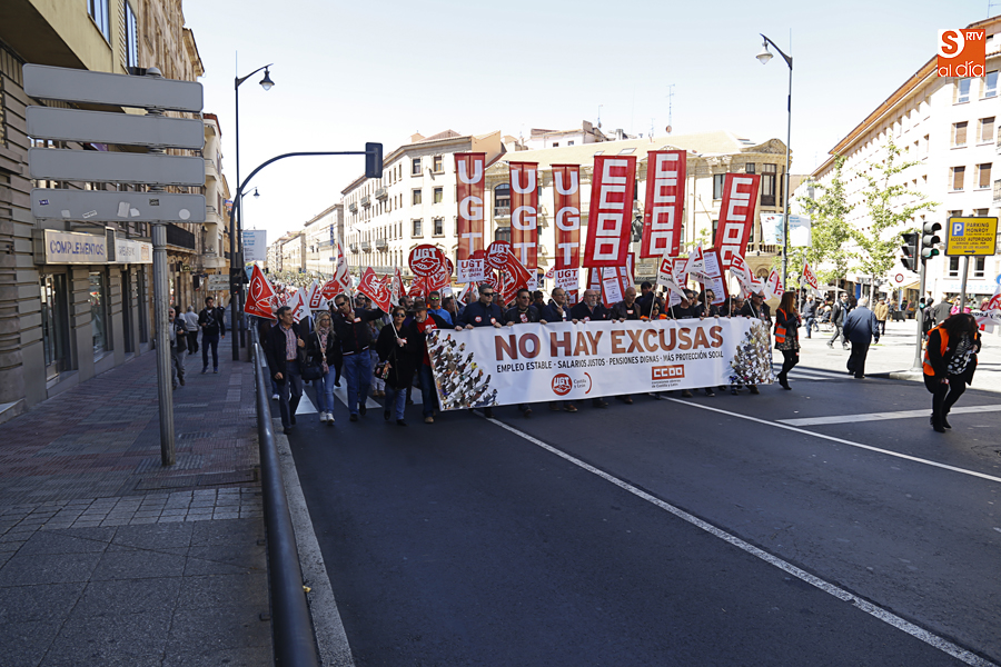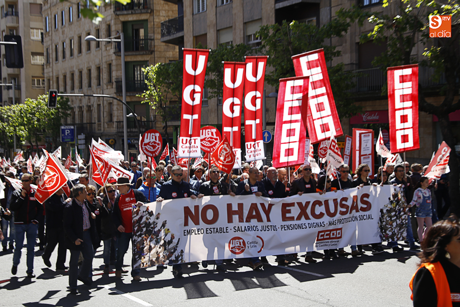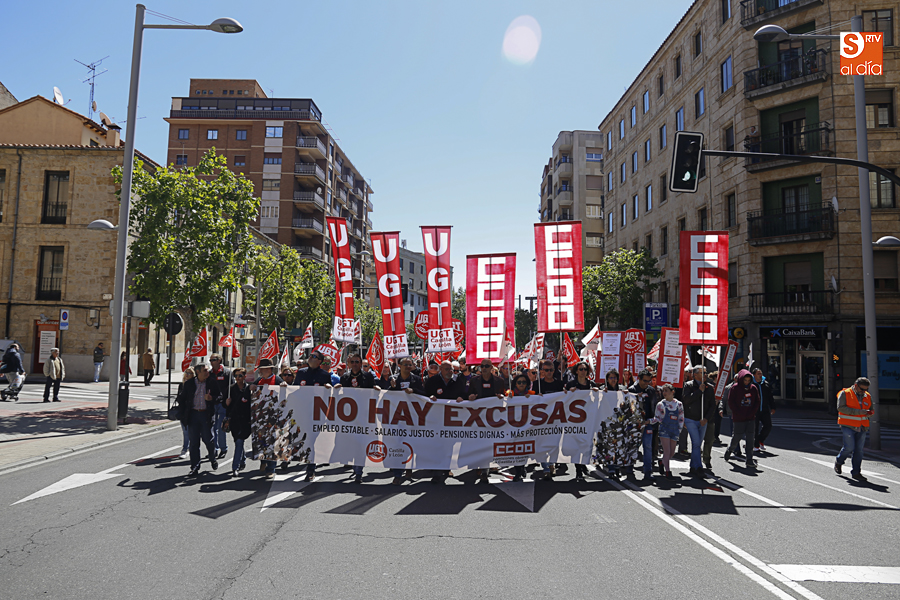 Bajo el lema 'No hay excusas, a la calle', los sindicatos han salido de nuevo este 1 de mayo a la calle para reinvidicar salarios y empleo digno, entre otros derechos laborales que, como han señalado los representantes de los dos sindicatos mayoritarios en Salamanca, CCOO y UGT, nos han arrebatado "con las dos últimas reformas". La coincidencia de la fecha con un puente festivo no ha mermado la participación en la manifestación con respecto a otros años y que ha partido desde Gran Vía para recorrer parte del centro de la ciudad, variando este año ligeramente el recorrido, hasta desembocar en la Plaza Mayor para dar lectura al manifiesto conjunto del Día del Trabajador.