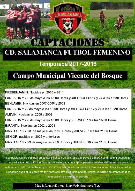 Para más información en http://cdsalamancaff.es/ o si alguna de las interesadas no pudiera asistir ninguno de los días fijados, pueden ponerse en contacto con el club en el email: coordinacion@cdsalamancaff.es.