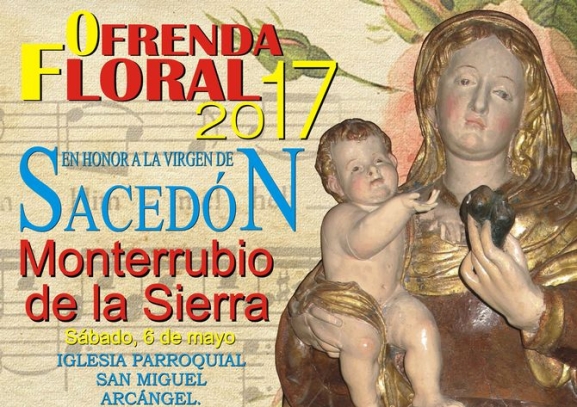 La iglesia parroquial de Monterrubio de la Sierra acogerá este sábado, 6 de mayo, la tradicional ofrenda floral en honor a la Virgen de Sacedón. Organizada por la asociación cultural del municipio, la ofrenda floral tendrá lugar tras la celebración de la misa, prevista para las cinco de la tarde, y posteriormente habrá un concierto lírico con la soprano Rosario Comerón Mateos, que estará acompañada al piano por Susana Arroyo San Teófilo.