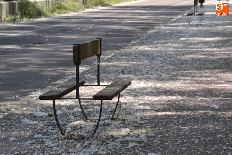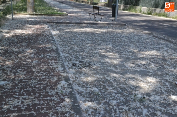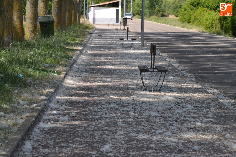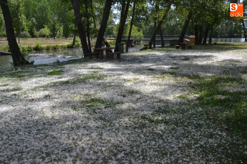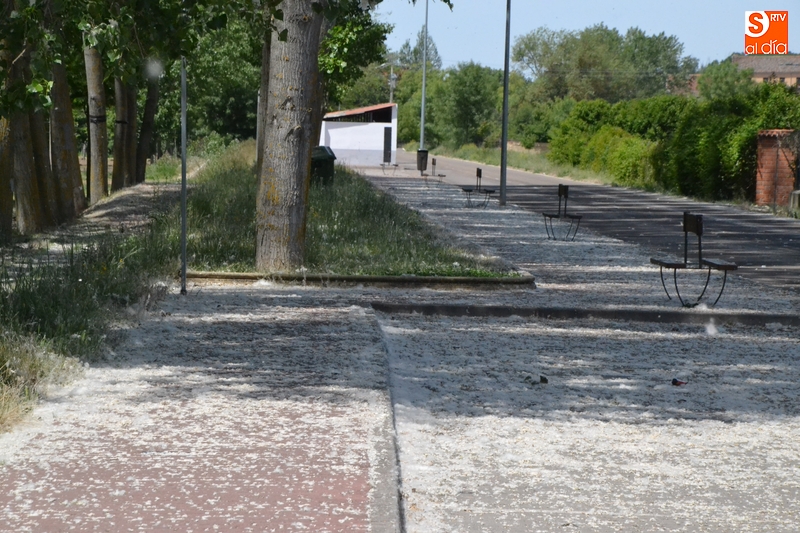 Precisamente, como si fuera la nieve del invierno, las pelusas del chopo están dejando un notorio manto blanco en varios puntos de Ciudad Rodrigo. Por ejemplo, en la isla del Picón había en la mañana del lunes un punto de alta concentración de pelusas en el suelo, así como en parte del tramo de acera de la Avenida de La Concha. De igual modo, se puede ver el río Águeda con numerosas 'motas' blancas.