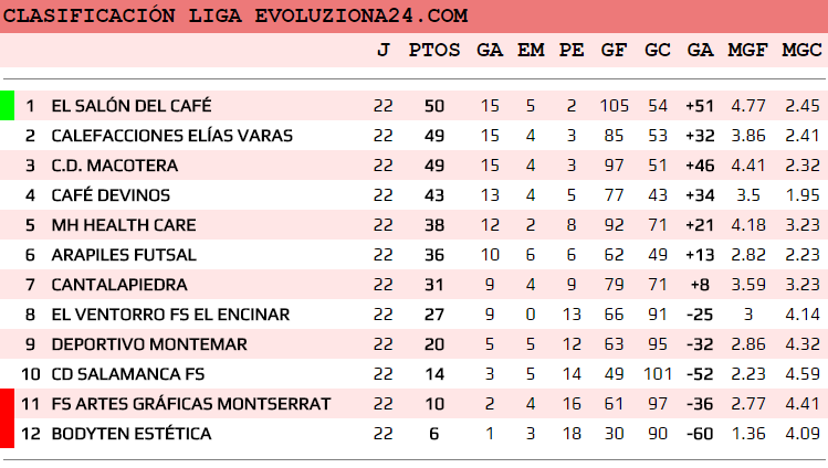 Los otros dos equipos que luchaban por la liga, consiguieron vencer en sus encuentros: CALEFACCIONES ELÍAS VARAS ganó por la mínima al CAFÉ DEVINOS (3-2), y de esta manera el equipo debutante este año en Asafusa-2M13, consigue la segunda plaza.