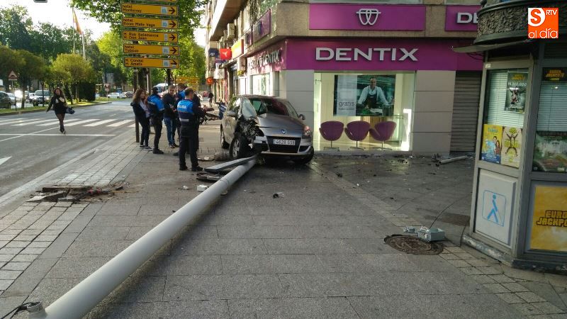 Un espectacular accidente de tráfico en pleno centro de la ciudad se ha saldado sin heridos, a pesar de que el coche se salía de la calzada en la avenida de Mirat, a la altura de la calle Toro, donde el coche derribaba una farola y acababa sobre la acera, junto a una clínica dental.