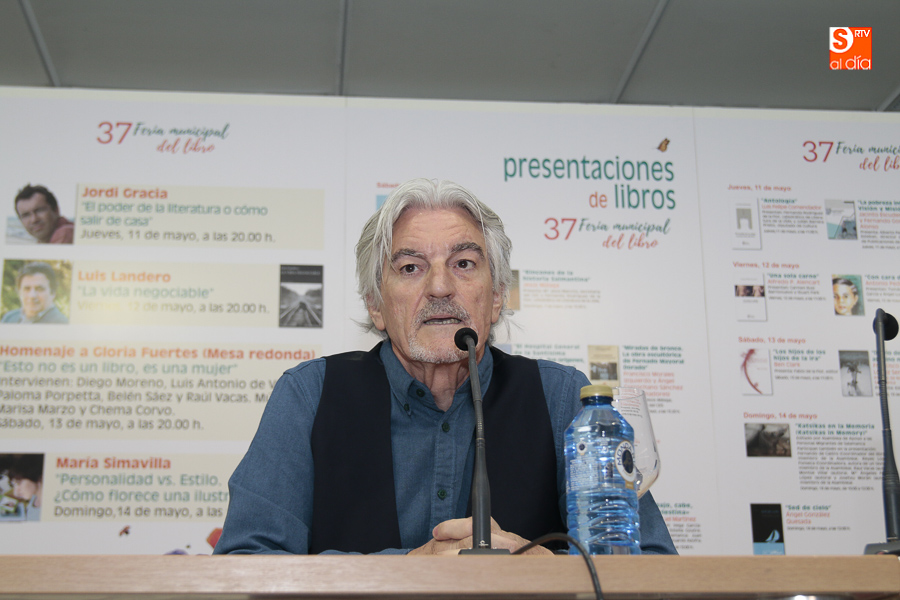Viste Ángel González Quesada de profundo azul, quizás para rimar con la portada del último de sus libros 'Sed de cielo' o para recordar que fue con este título con el que el nicaragüense Rubén Darío inició el Modernismo. El último día de la Feria es un domingo azul de prosas profanas y versos de corte clásico escritos por la mano de uno de los autores más originales de Salamanca: Ángel González Quesada, actor, dramaturgo, poeta, filósofo de formación no solo ha añadido un título más a la treintena de libros que conforman su trayectoria, sino que ha hecho un trabajo para, por, con, de y desde Rubén Darío, tomando vida y obra para desde Darío no escribir sobre Darío, sino con Darío, incluso, en el lecho de muerte del autor, desde su erotismo enamoradizo.