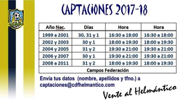 El CDF Helmántico, a través de Carlos Hernández, coordinador del conjunto salmantino, envió un comunicado en el que informa de la apertura del periodo de captaciones que tendrán lugar en los campos de