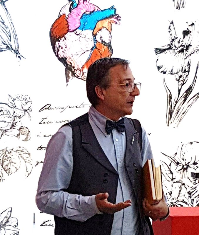 Además del texto de Alencart, el reconocido artista ha caligrafiado e ilustrado textos de nueve poetas portugueses: Fernando Pessoa (Sossega, coração! Não desesperes!), António Salvado (Infância), Helder Macedo (Para as sombras da Lourdes Castro), José Luís Mendonça (Teu ser), Margarida Vale de Gato (A imagem romántica), Raquel Nobre Guerra (Pura), Lopito Feijó (Meditando), Vasco Gato (Traço comum), José Viale Moutinho (O amoroso) y Cláudia R. Sampaio (Tragam-me um homem que me levante?). Y, para completar la muestra, Miguel Elías expone una serie de pinturas Sumi-E inspiradas en flores y plantas, las cuales forman parte de una Botánica que está preparando.