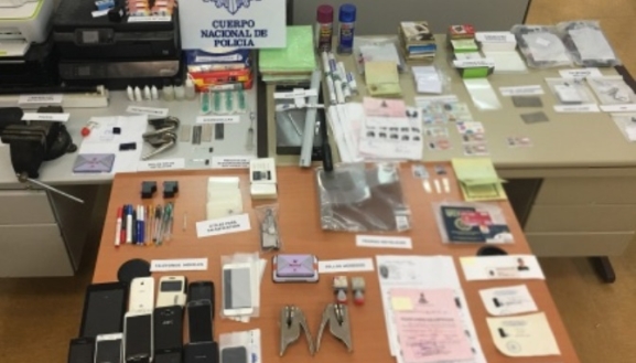Los investigadores localizaron en el domicilio del arrestado, en la localidad madrileña de Móstoles, un completo laboratorio en el que producían los documentos ilícitos. Contaba con ordenadores dotados de avanzados programas de edición, impresoras, una plastificadora, una prensa, sellos húmedos y secos, luz ultravioleta, diferentes tintas y otros materiales para sus actividades ilícitas, así como varios documentos falsos ya elaborados.