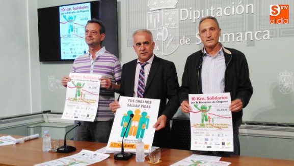 El diputado de deportes, Jesús María Ortiz, Javier Diego, secretario de la Asociación Alcer, y Moisés Muñoz, delegado provincial de atletismo en Salamanca, presentaron la carrera '10 Km Solidarios por la Donación de Órganos', incluida en el IV Calendario de Carreras Populares Diputación de Salamanca.