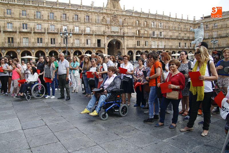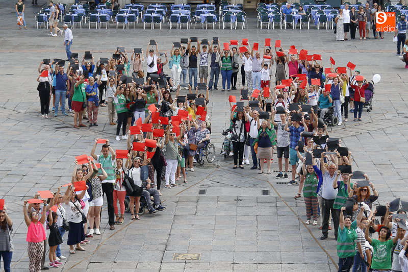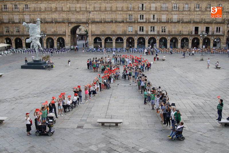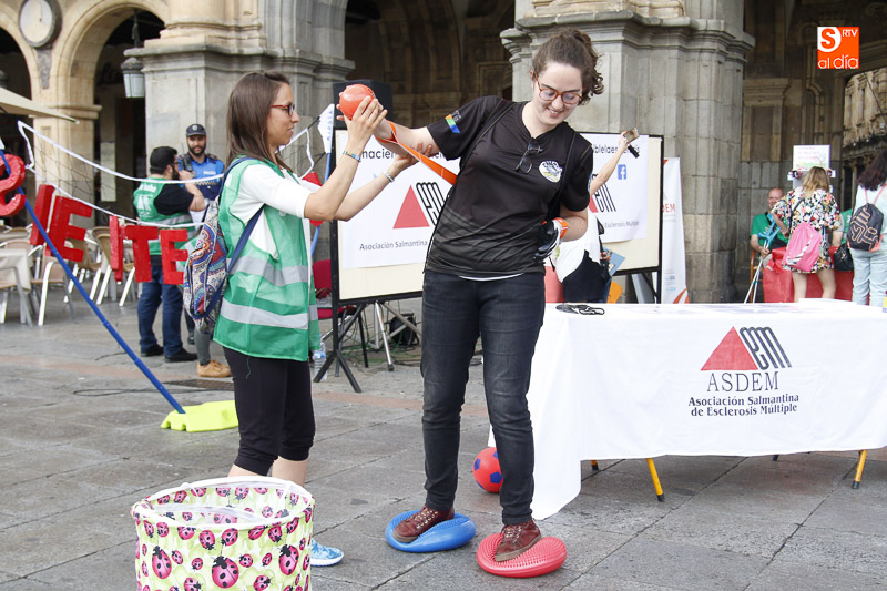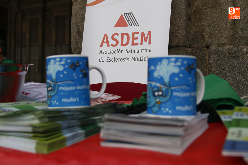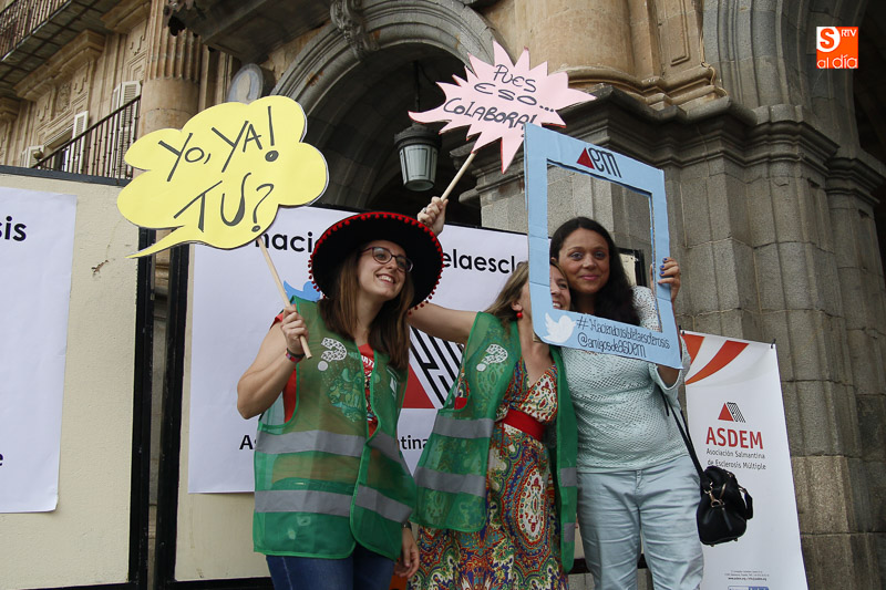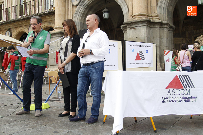 'Haz visible lo invisible' es el lema con el que este año se celebra el Día Mundial de la Esclerosis Múltiple. La Asociación Salmantina de Esclerosis Múltiple ha realizado esta tarde un mosaico humano en la Plaza Mayor para llamar la atención sobre una enfermedad crónica del sistema nervioso central que afecta a más de 47.000 personas en España, 600.000 en Europa, y 2.500.000 en todo el mundo. El acto ha contado con la concejala de Salud Pública, María José Fresnadillo.