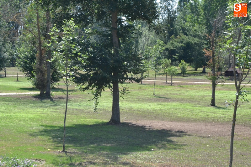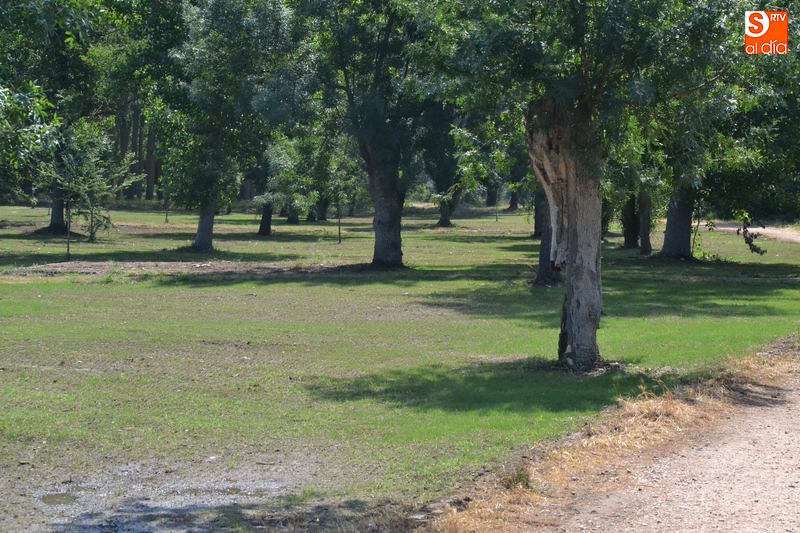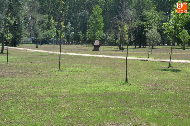 El suelo de la zona de la Alameda Vieja de Ciudad Rodrigo que sufrió hace dos años una importantísima pérdida de árboles (en su lugar fueron plantados otros mucho más jóvenes) está durante estos días tiñéndose de color verde, al ir creciendo el césped plantado hace algunas unas semanas.
