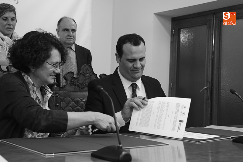 La vicerrectora de Internacionalización, Mª Ángeles Serrano, y el alcalde de Santa Marta de Tormes, David Mingo, han firmado este jueves, en el Rectorado de la Universidad de Salamanca, un convenio para la difusión conjunta y la divulgación de la cultura gastronómica de la región.