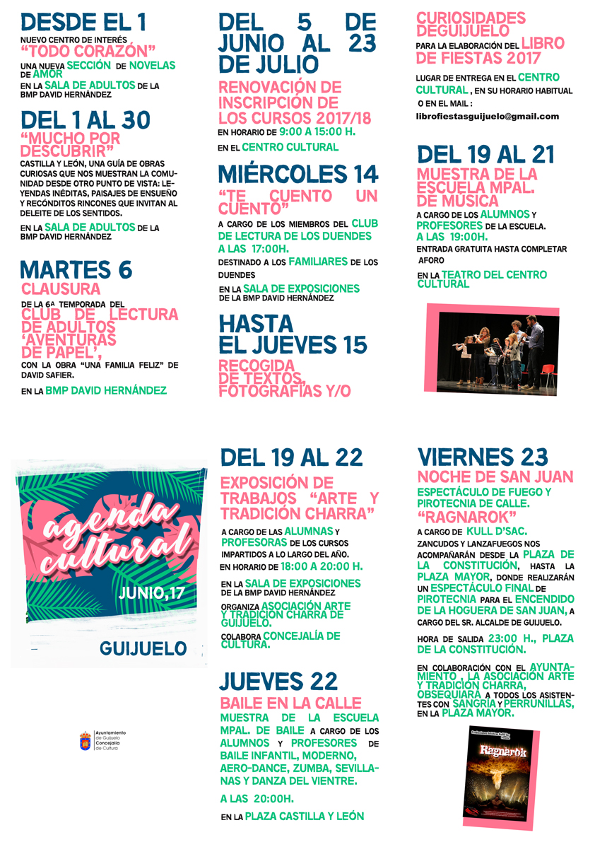 En el centro cultural también se prepararan para el final de curso con la mente pensando en el siguiente. Del 5 al 23 de junio se abre el plazo de renovación de la inscripción para los cursos municipales 2017/2018, en horario de 09:00 a 15:00 horas. Del 19 al 21 de junio será el turno de la música, con las actuaciones de los alumnos de la Escuela Municipal de Música, con todas las sesiones a partir de las 19:00 horas. Una de las mayores novedades de la agenda es la que protagoniza la Escuela Municipal de Baile, que ofrecerá sus actuaciones de final de curso en la plaza de Castilla y León, en lugar de el habitual teatro municipal, invitando al público a a acercarse a conocer los avances de los bailarines locales. El evento agrupará a todos los alumnos de la escuela: baile infantil, moderno, aero dance, zuma, sevillanas y danza del vientre el jueves, 22 de junio, a las 20:00 horas.