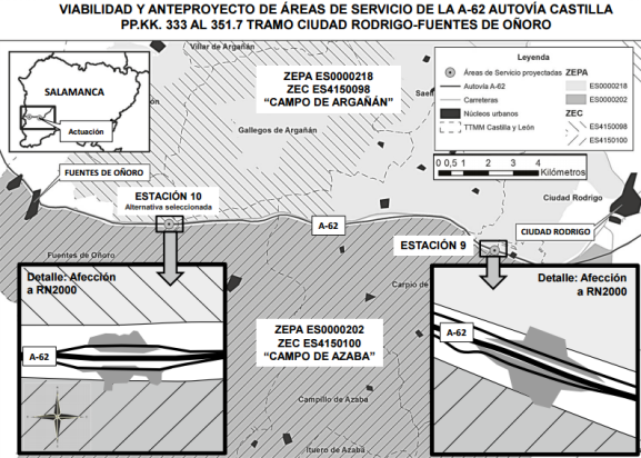 Hay que apuntar que a la hora de determinar en qué lugar de la A-62 entre Ciudad Rodrigo y Fuentes de Oñoro se construiría un área de servicio, se estudiaron dos opciones. Además de la finalmente escogida, la otra opción era ubicarla en el punto kilométrico 334,05, en el término municipal de Ciudad Rodrigo. Finalmente, se escogió la de Fuentes de Oñoro tras realizar un análisis "multicriterio", atendiendo a costes, seguridad vial, consecuencias sobre el usuario, consecuencias institucionales y consecuencias ambientales.