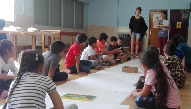 La actividad de la mañana del viernes comenzó con el reparto a los niños de una serie de preguntas, para que expresasen cuál es su color o su forma favorita, para que acabasen mostrando sus intereses sobre la vida. Una vez recogidas todas esas ideas, cada uno de los alumnos empezó a pintar su propio dibujo en un gran rollo de papel extendido por el suelo. Aunque cada uno realizaba su propio dibujo, poco se fueron 'entrelazando'.